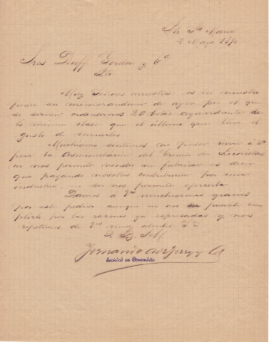 Carta de Fernado A. de Terry a Sres. Duff Gordon y C.º anunciando no poder servir la orden de 20 botas de aguardiente porque el Gremio de Licoristas no les permite vender ni fabricar