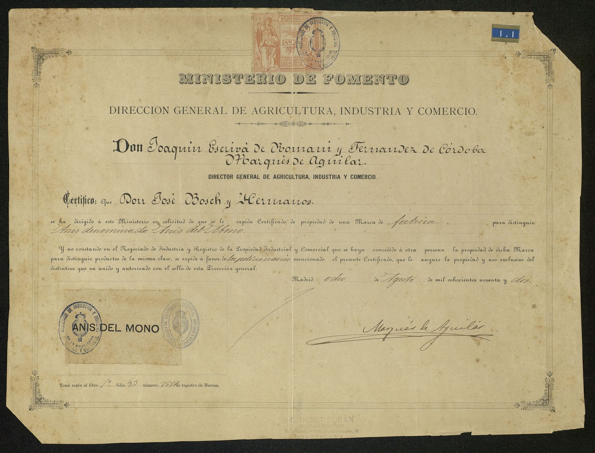 Diploma del Ministerio de Fomento del Registro de la marca Anís del Mono para el anís