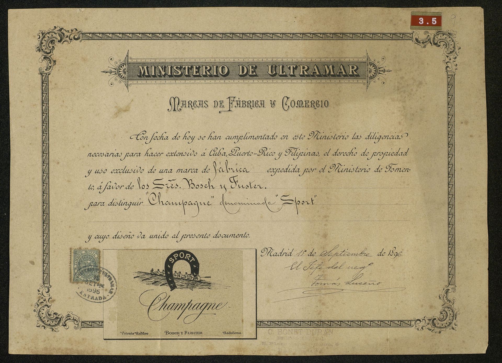 Diploma del Ministerio de Ultramar sobre el registro de "Champagne Sport" de Bosch y Fuster para Cuba, Puerto Rico y Filipinas
