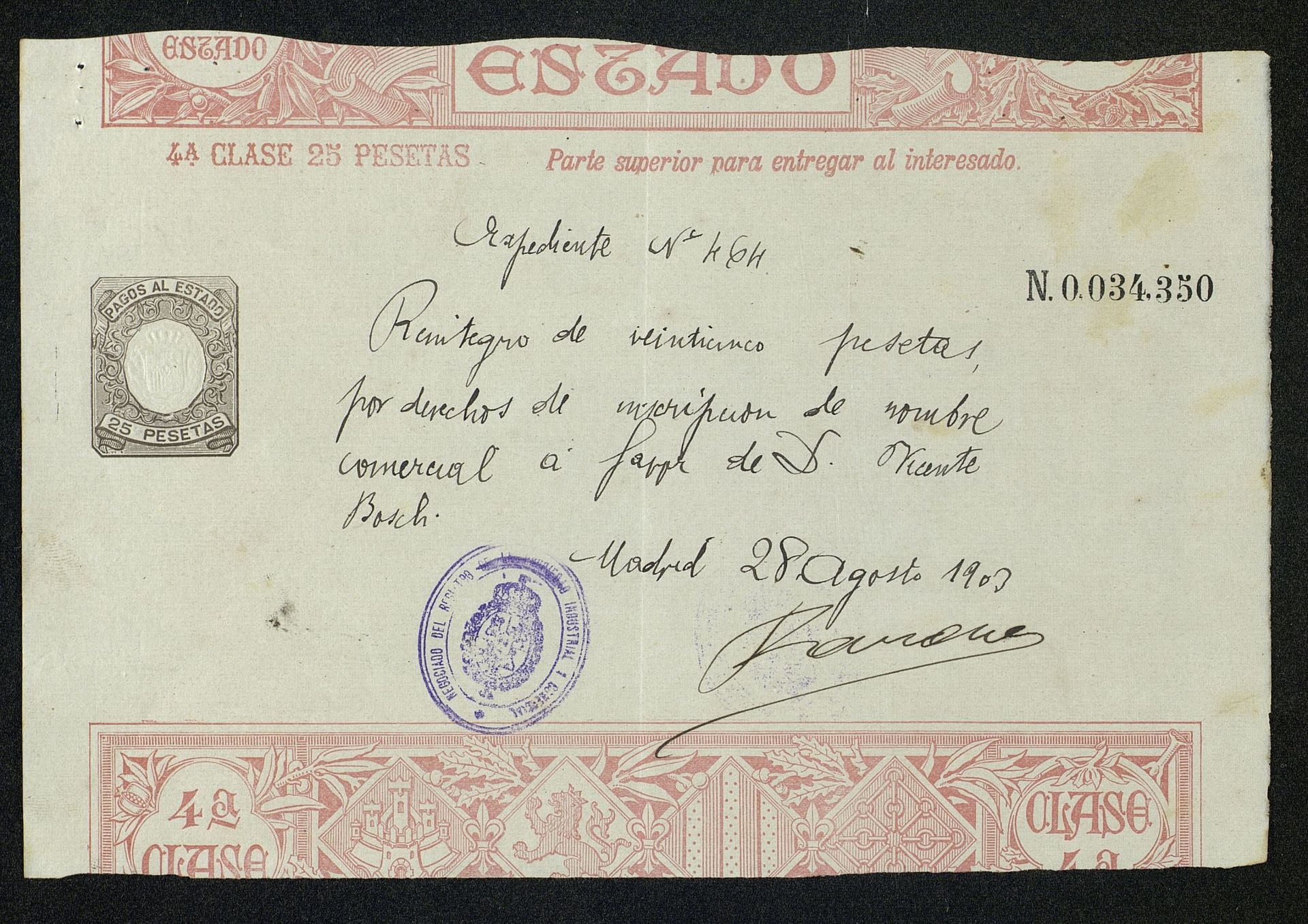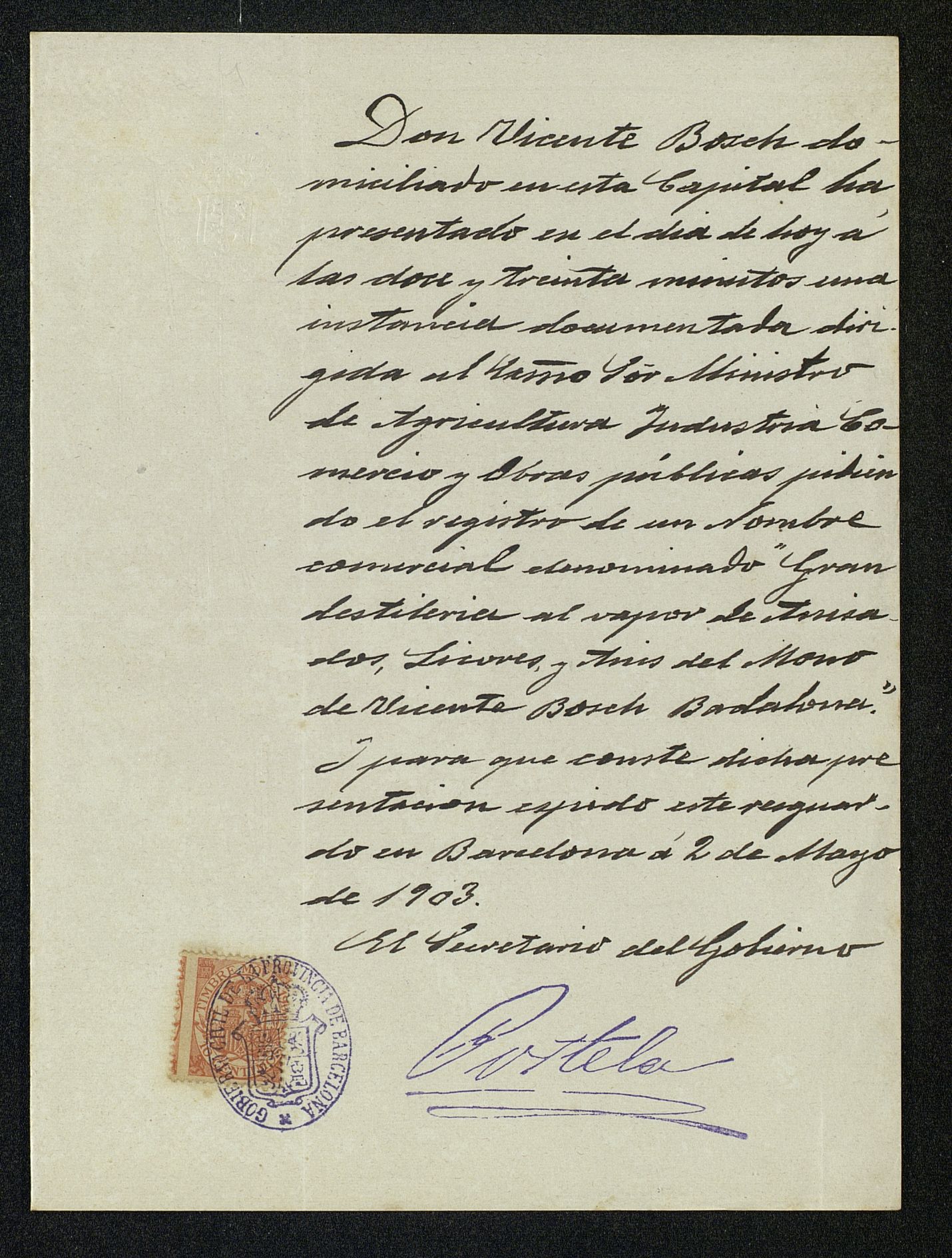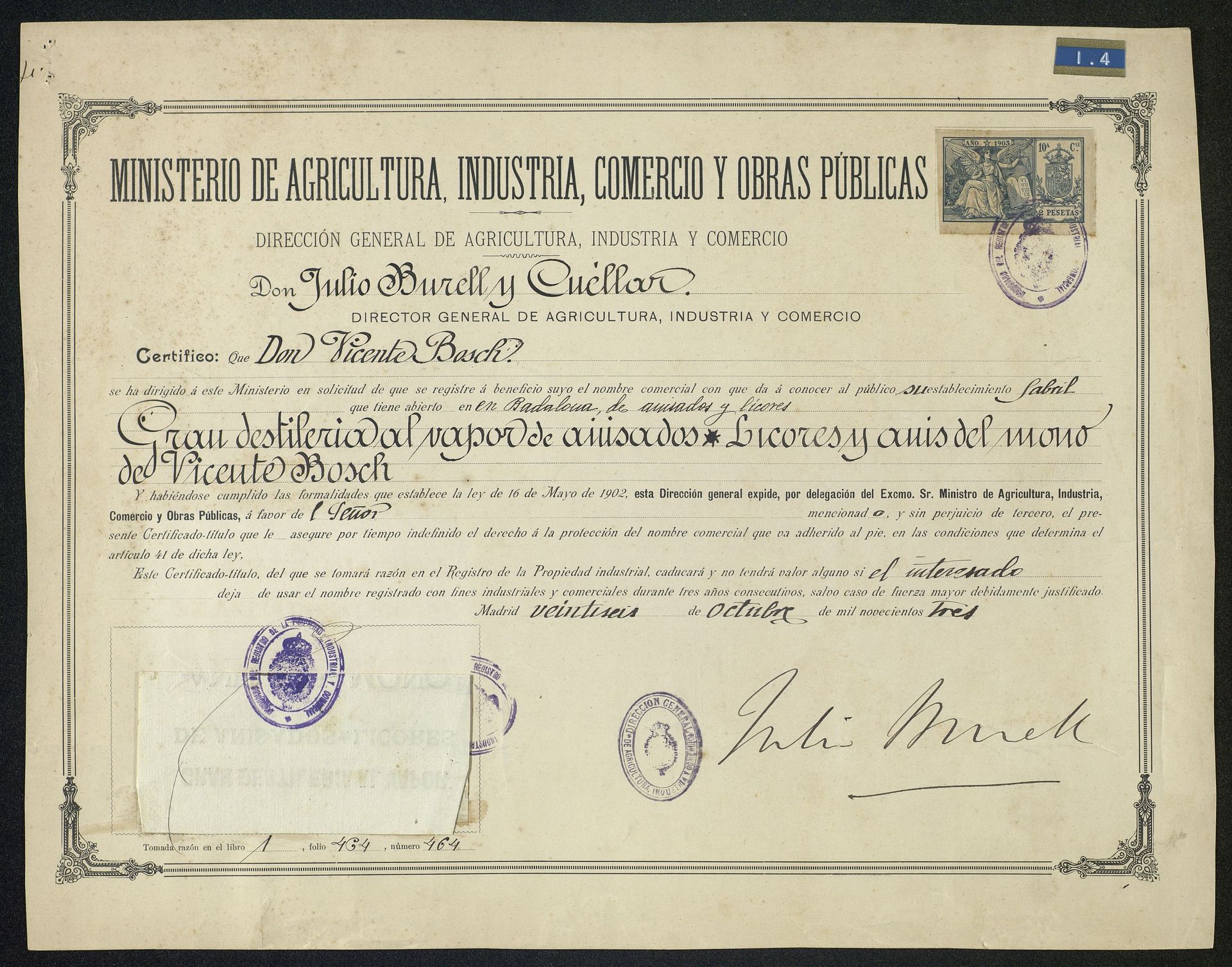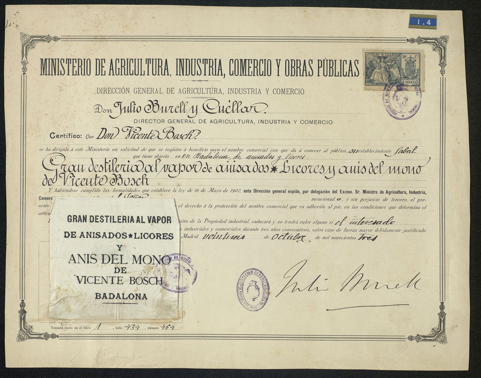 Registro de Anís del Mono el 26.10.1903 como Gran Destilería al Vapor de Anisados, Licores y Anises del Reino. Vicente Bosch