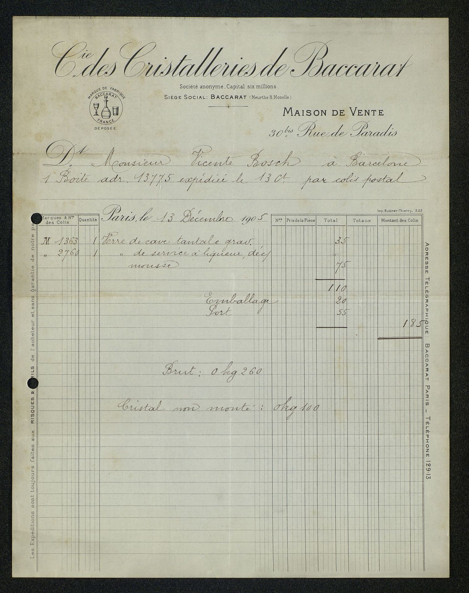 Factura de Cie des Cristalleries de Baccarat