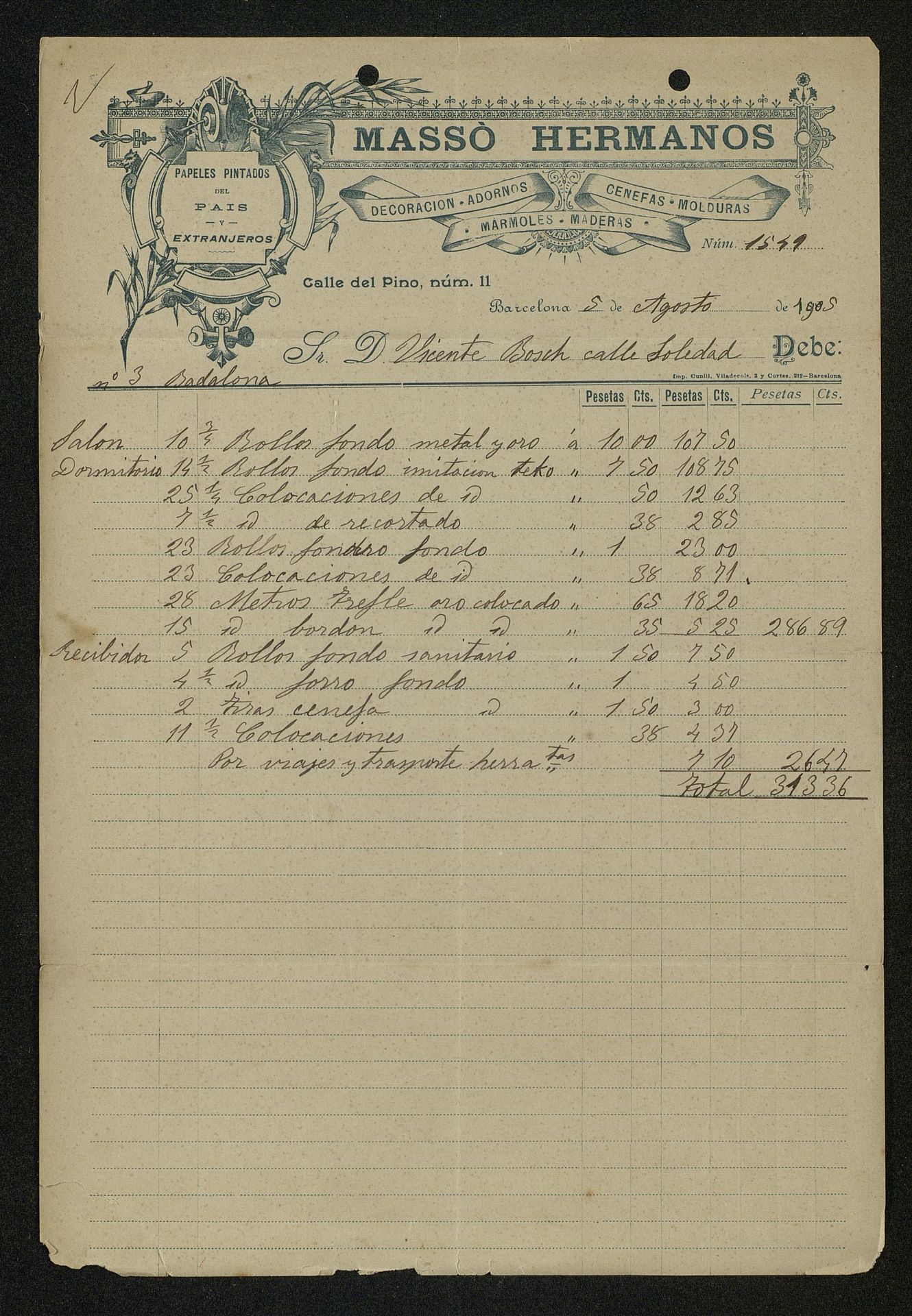 Factura nº 1549, 1905, ago. 05 de Massó Hermanos papeles pintados del país y extranjero por trabajos varios en salón, dormitorios y recibidor