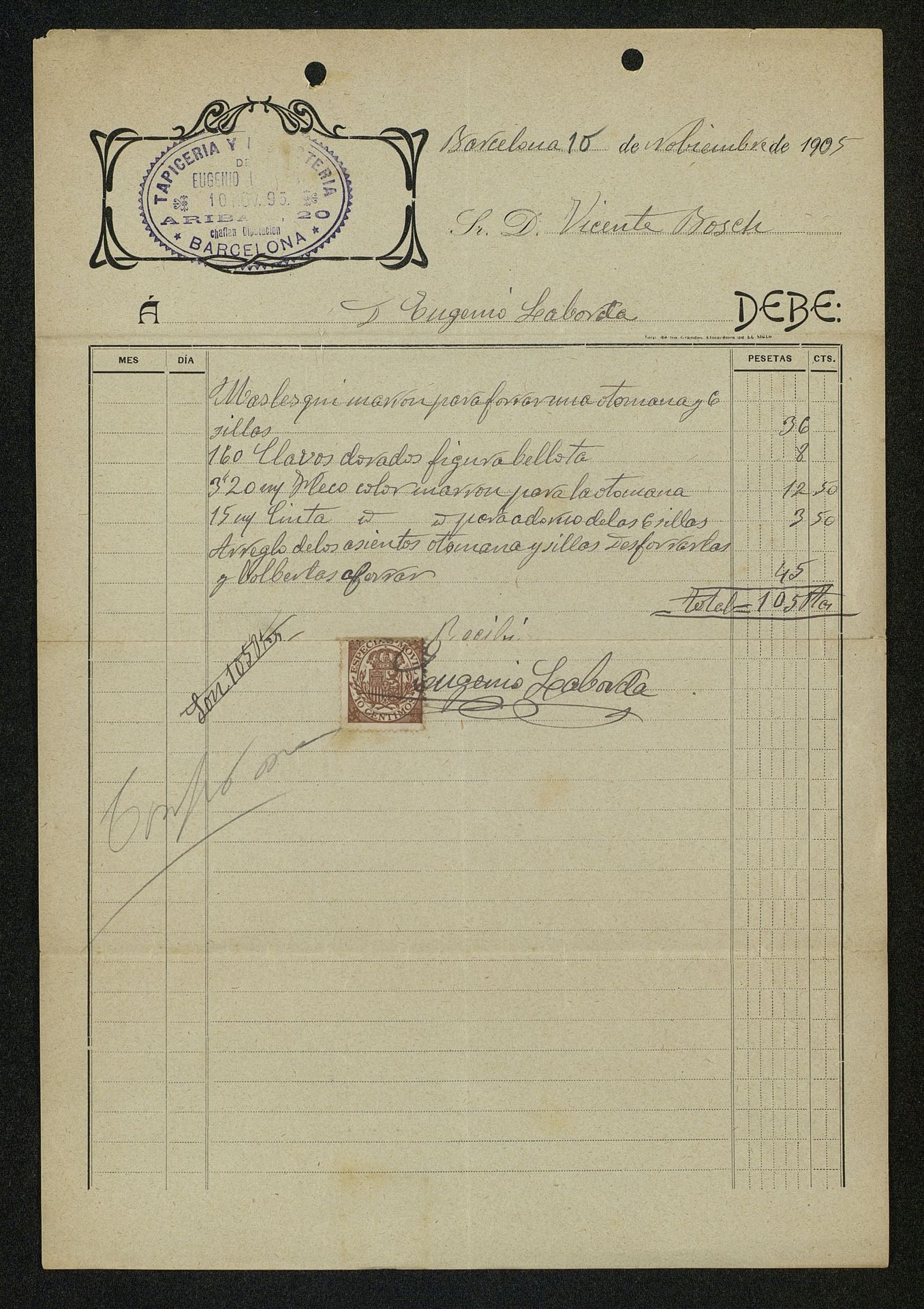 Factura, 1905, nov. 10 de Tapicería Eugenio Laborda por materiales y forrado de 1 otomana y 6 sillas