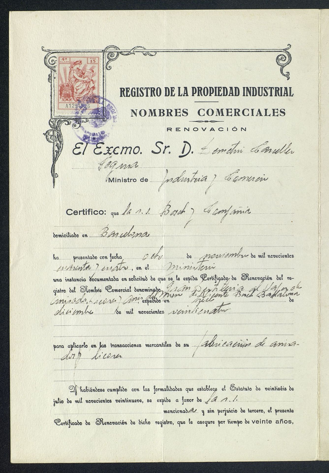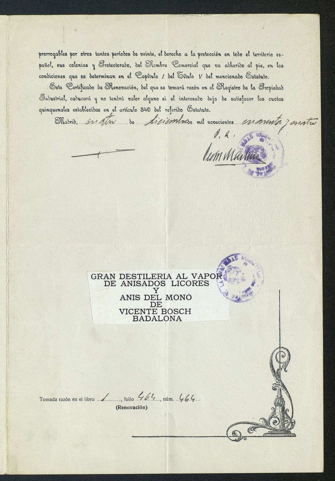 Certificado de renovación del registro de la propiedad intelectual número 464 del nombre comerical: Gran destilería al vapor de anisados y licores Anís del Mono de Vicente Bosch Badalona (cataluña, España)