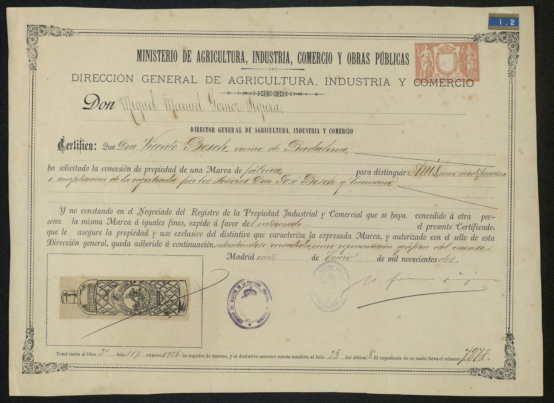 Certificado del Ministerio de Agricultura, Industria y Comercio que concede el uso de "Anís" como modificación de la registrada