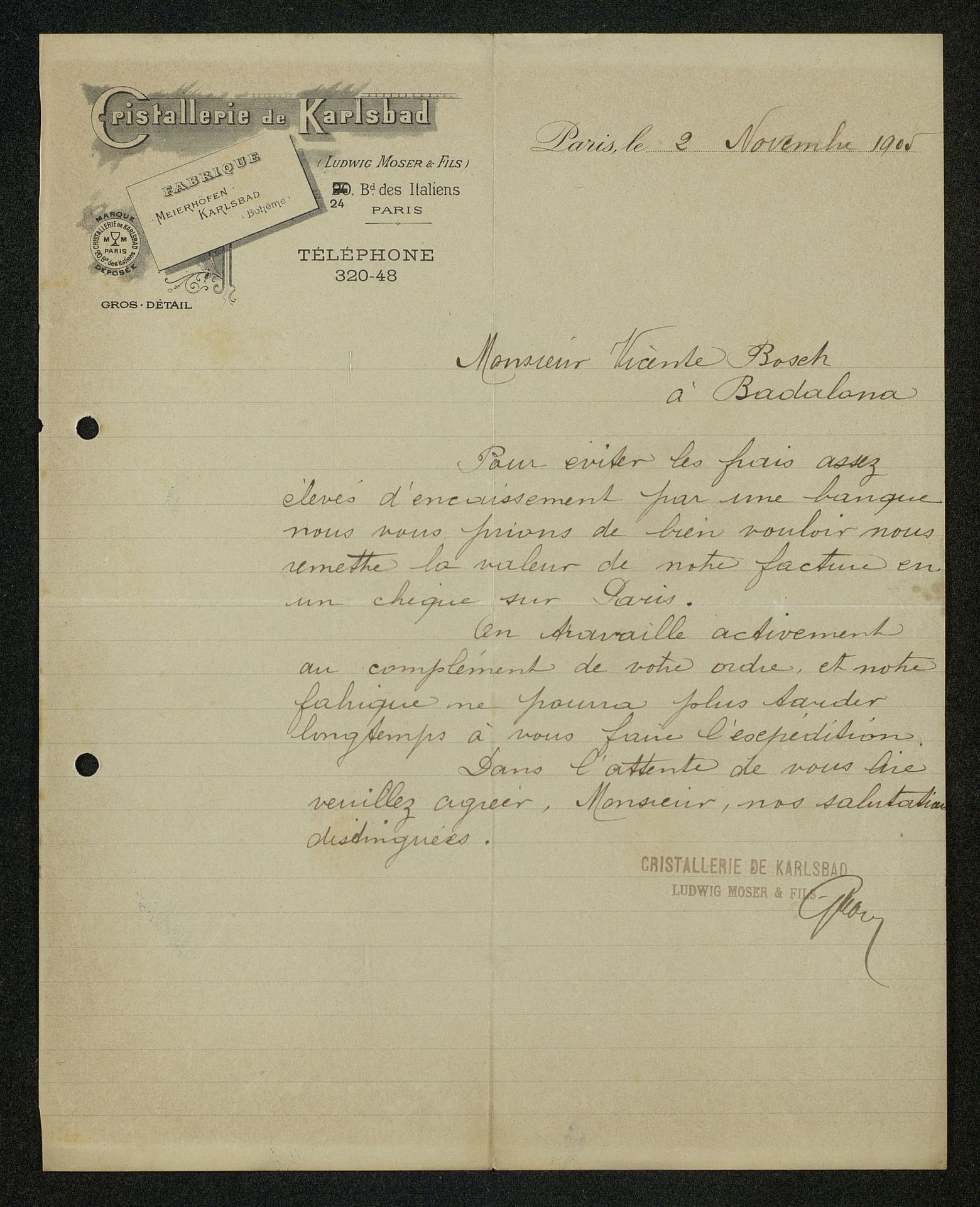 [Carta] 1905, nov. 02 de Cristallerie de Karlsbad a Vicente Bosch en francés indicando que pagan la factura con un cheque en París para evitar comisiones