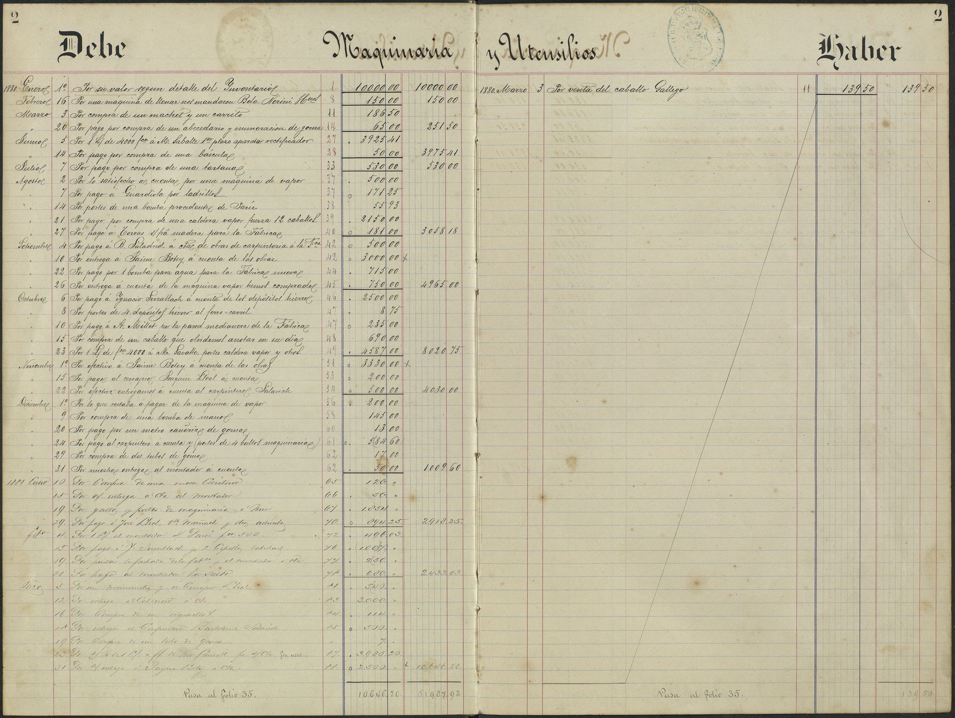 Compra del Rectificador Savalle & Fils (Primer pago en libro Mayor), bomba 12 caballos, y otros para nueva fábrica