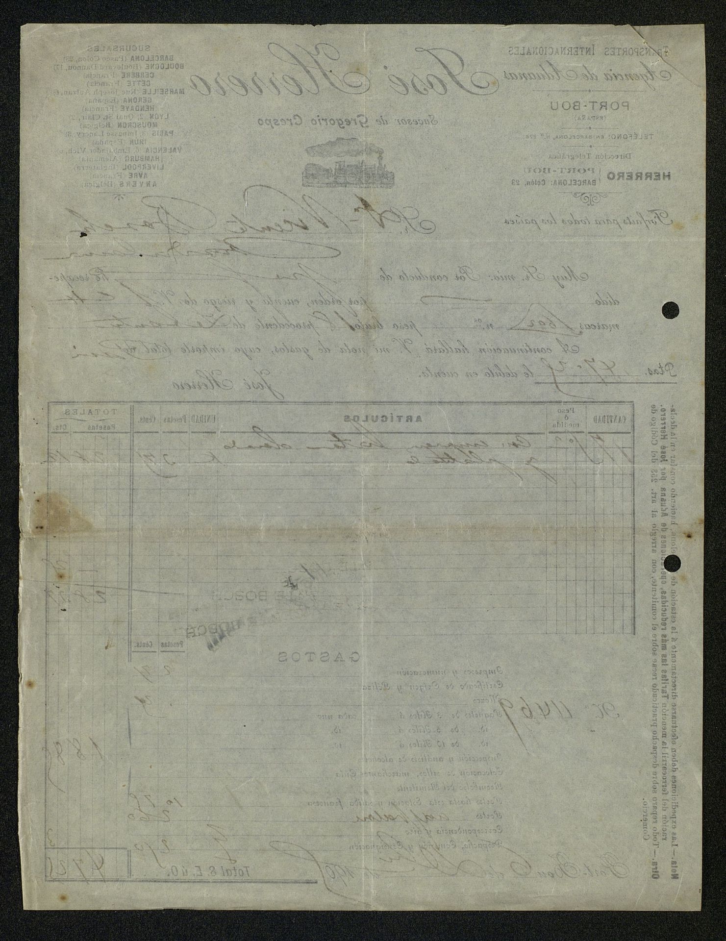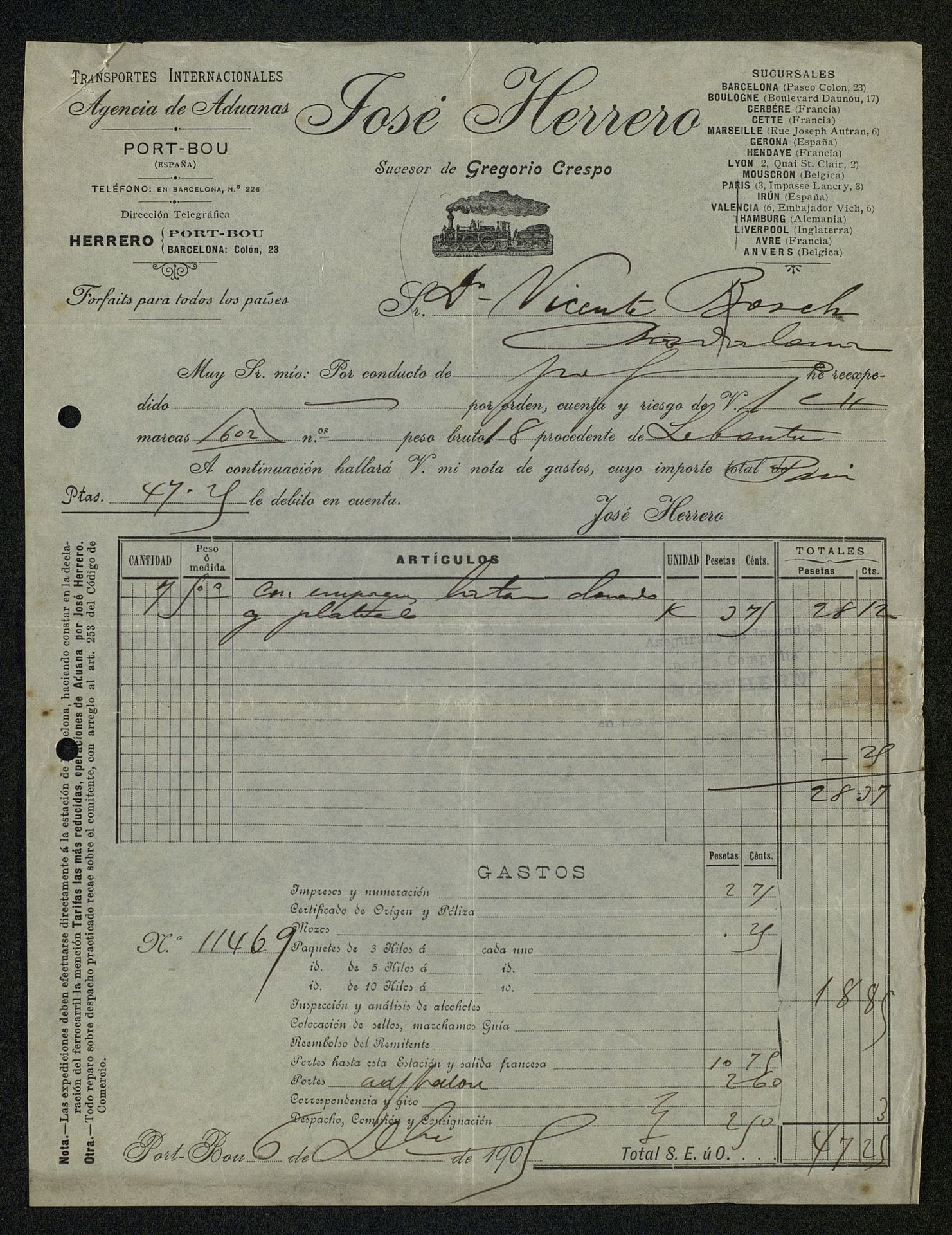 Factura, 1906, dic. 06 de José Herrero Transportes Internacionales y Agencia de Aduanas