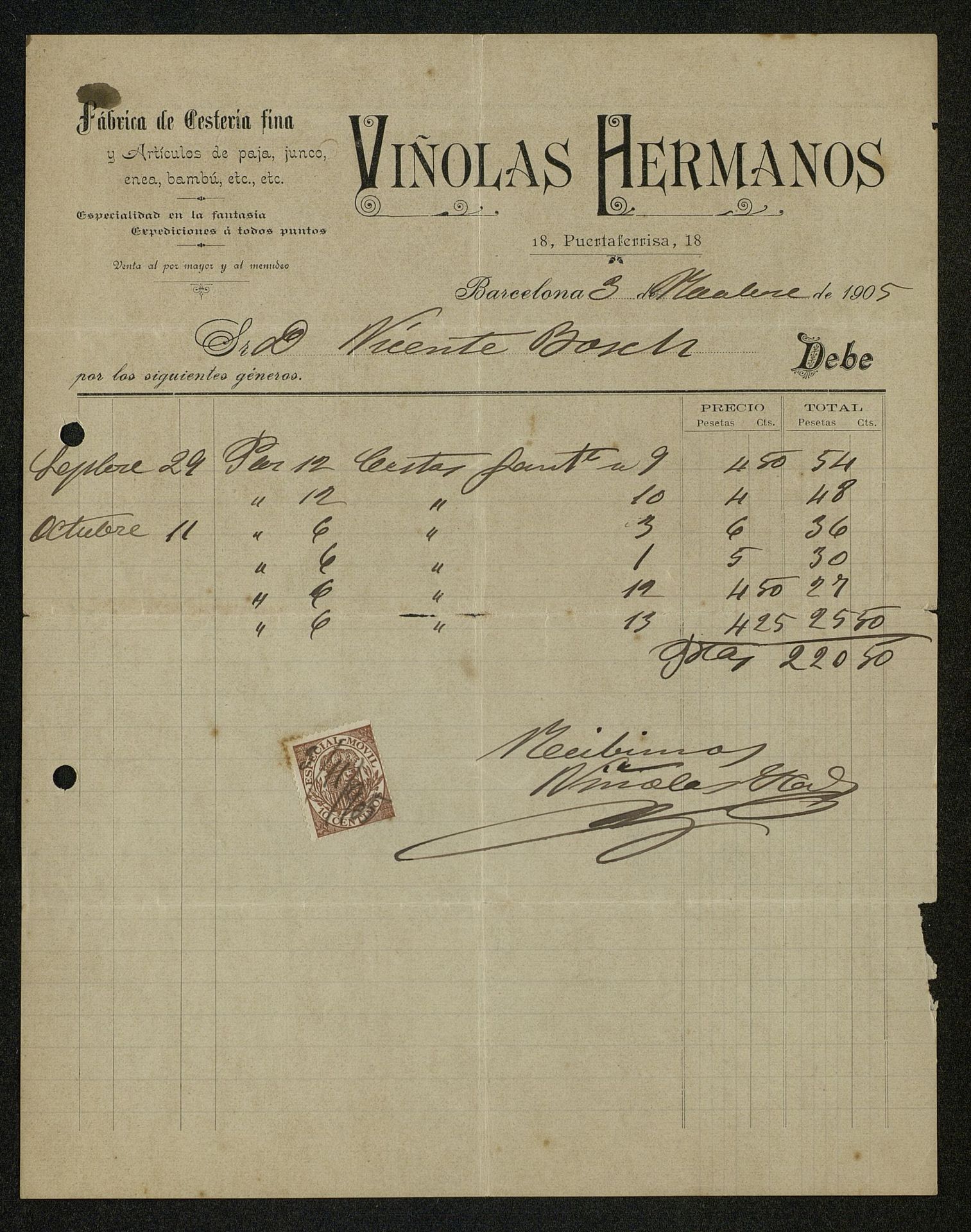Factura, 1905, nov. 03 de Viñolas Hermanos Fábrica de Cestería Fina por artículos de los meses septiembre y octubre