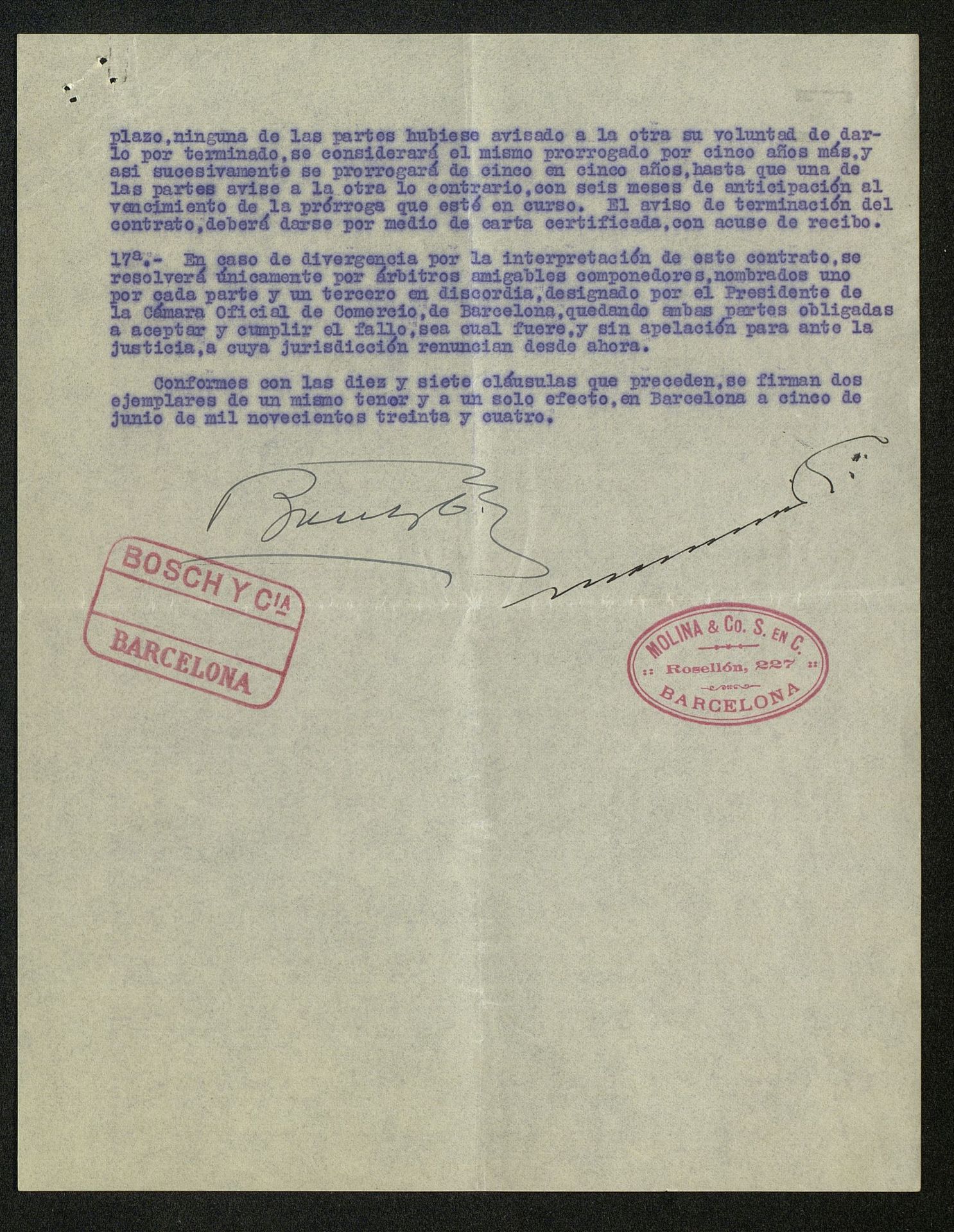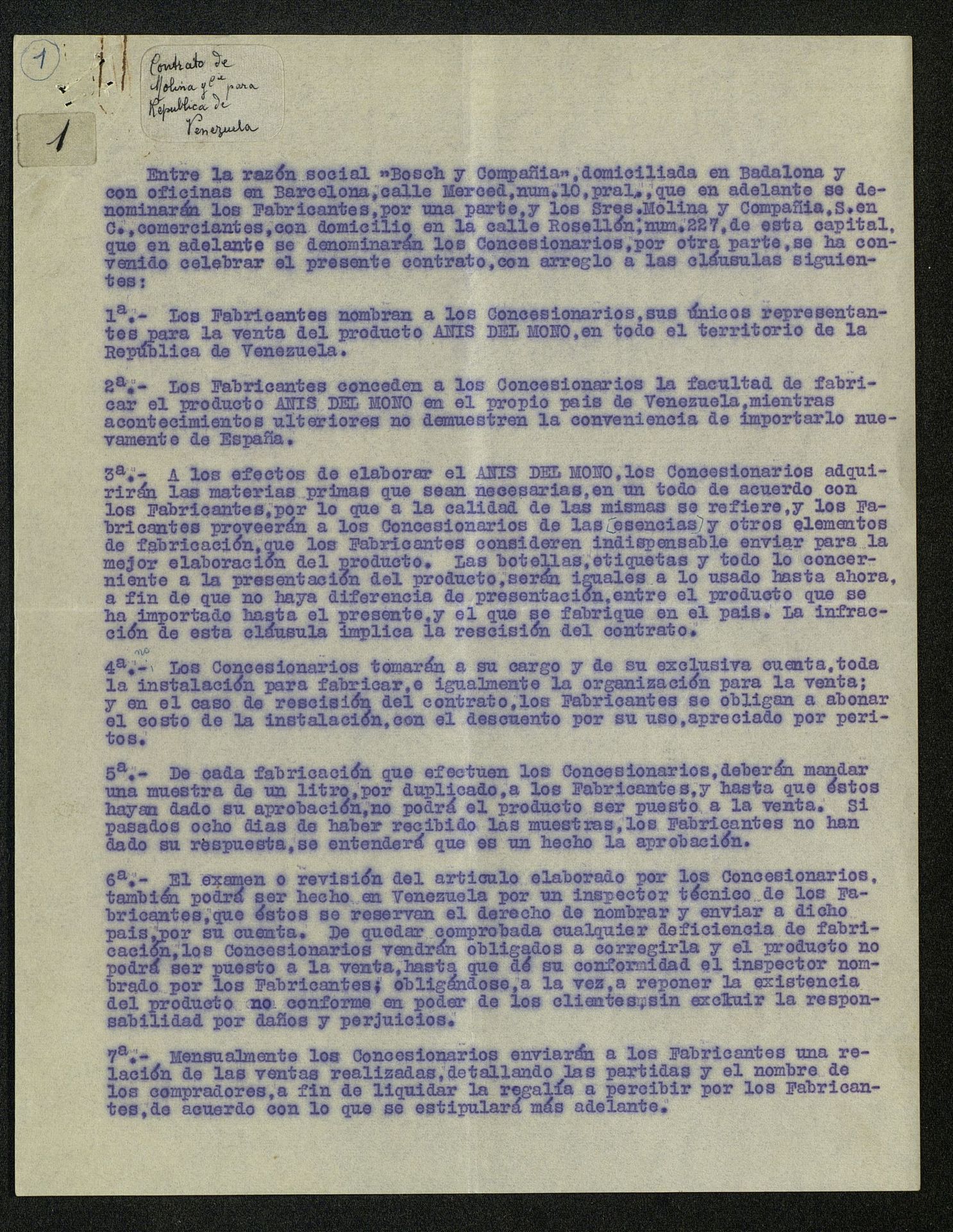 Contrato de los Señores Molina y Compañía por el que Bosch y Cía concede la facultad de fabricar Anís del Mono en Venezuela