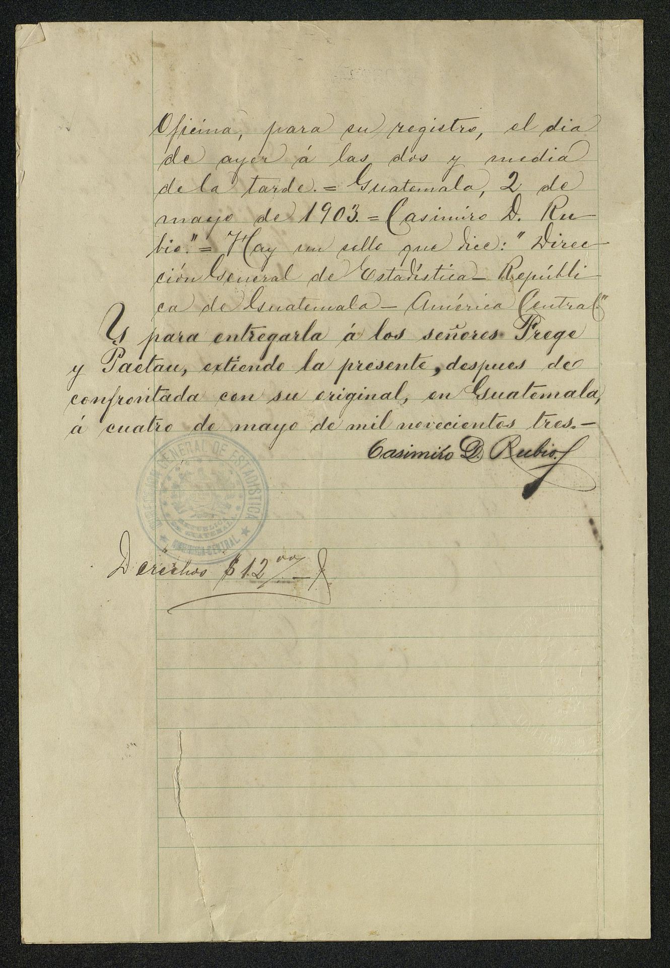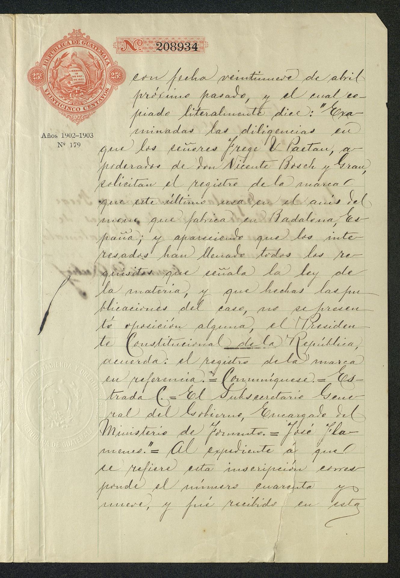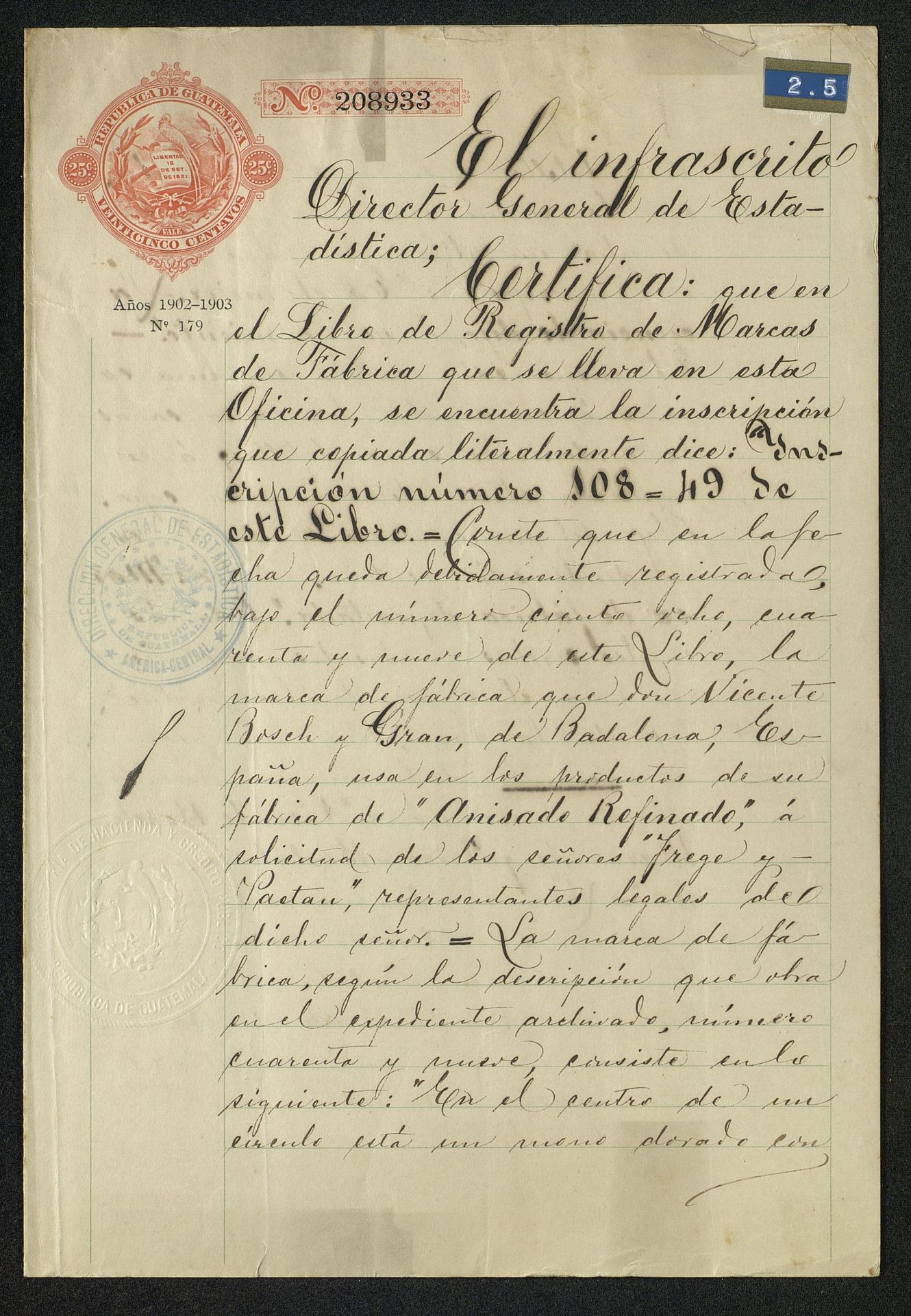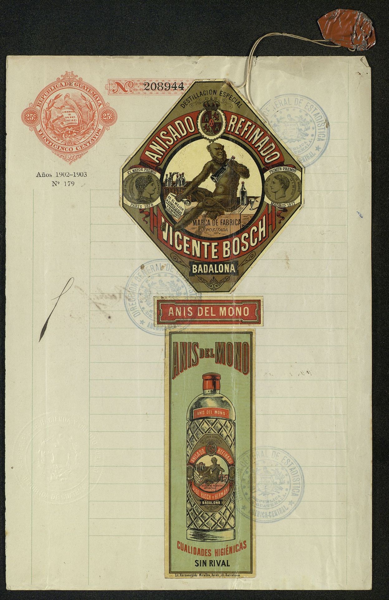 Registro de marca Anís del Mono en Guatemala en 1903 con muestra de la etiqueta, tapón de cobre e imagen de la botella