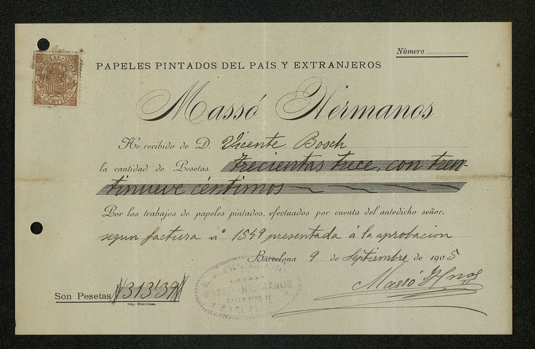 Recibo de Massó Hermanos Papeles Pintados del País y Extranjero por 313,39 céntimos