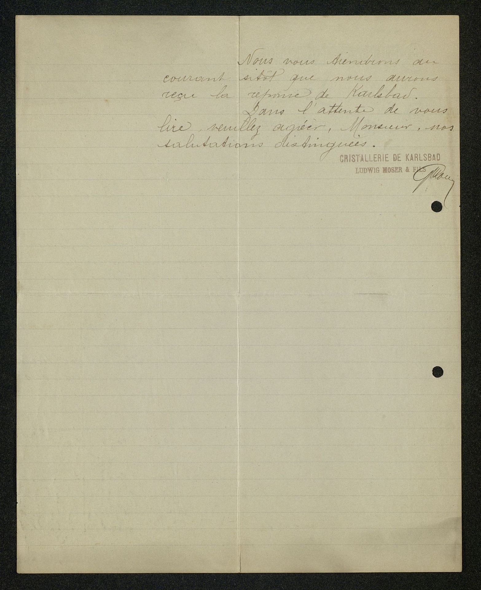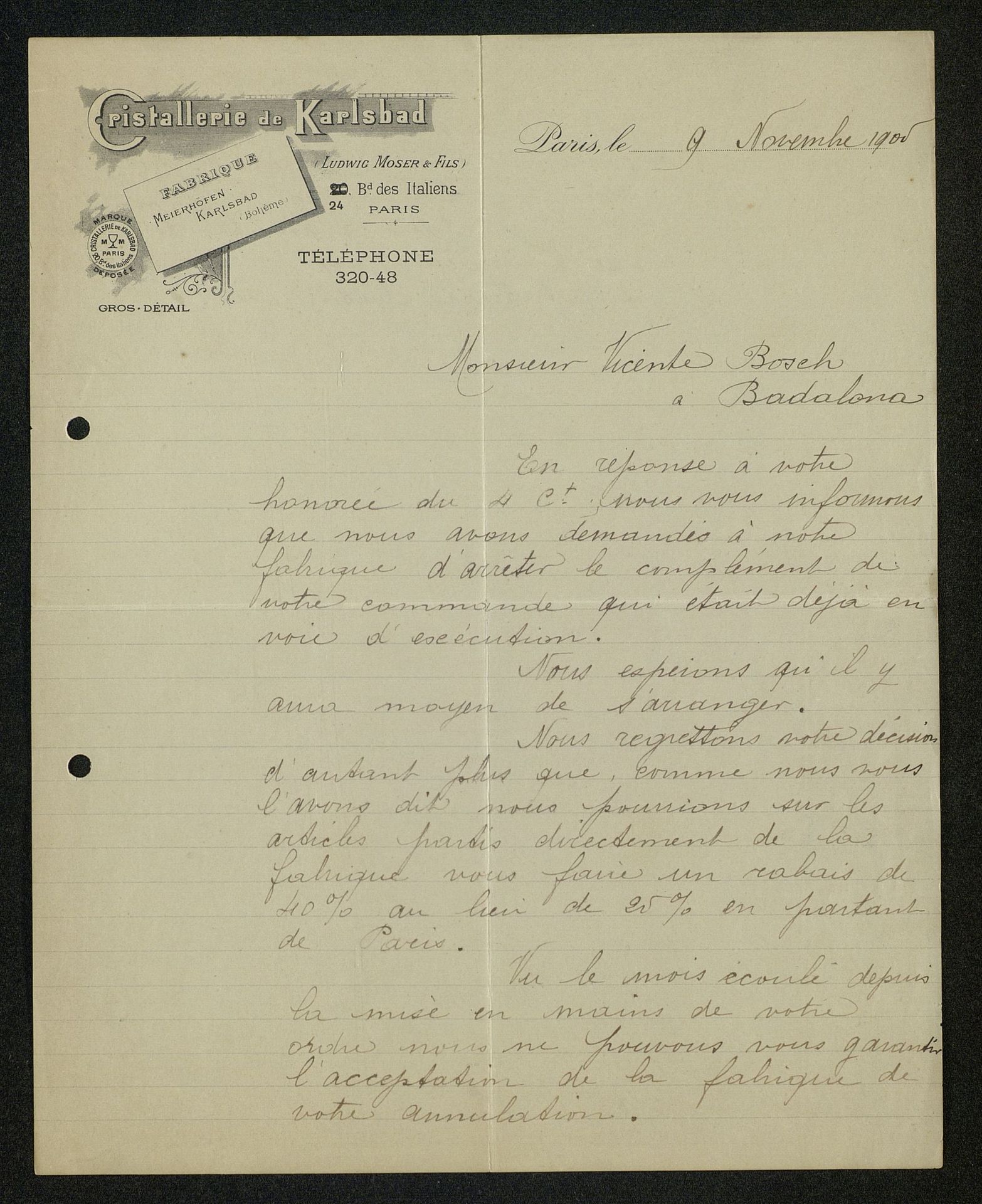 [Carta] 1905, nov. 09 de Cristallerie de Karlsbad a Vicente Bosch en francés indicando que paran la producción de su encargo por desacuerdo en el precio