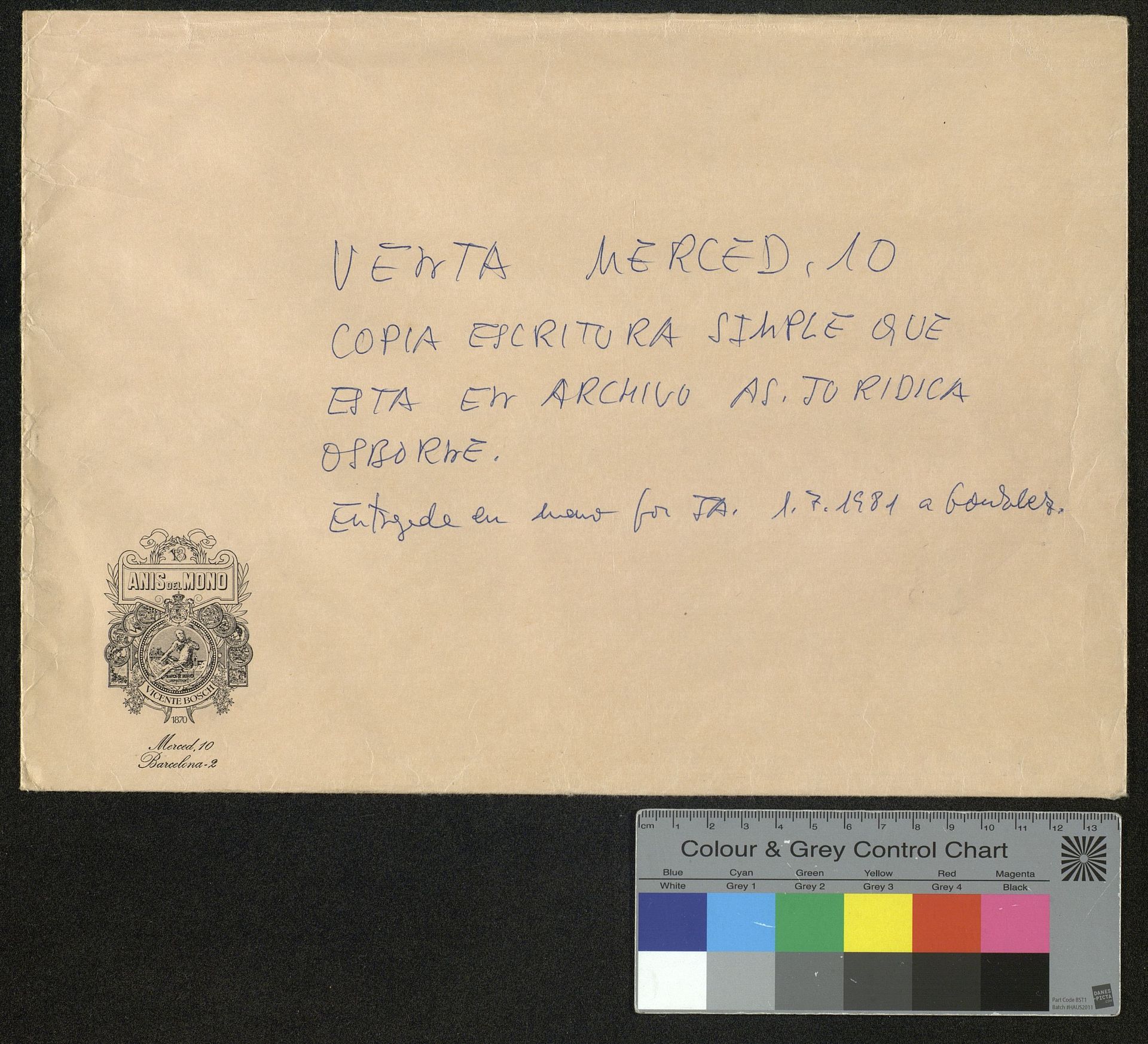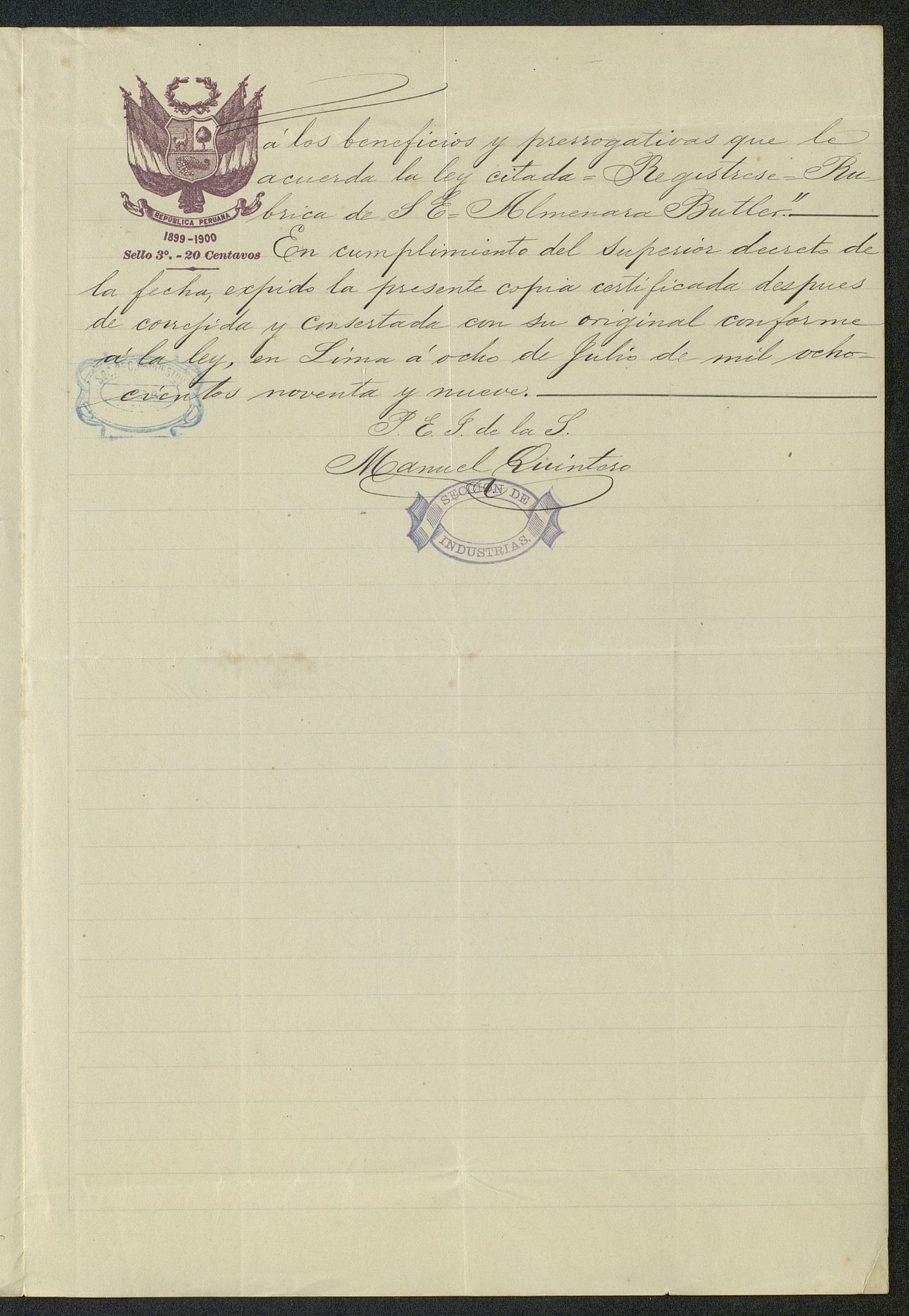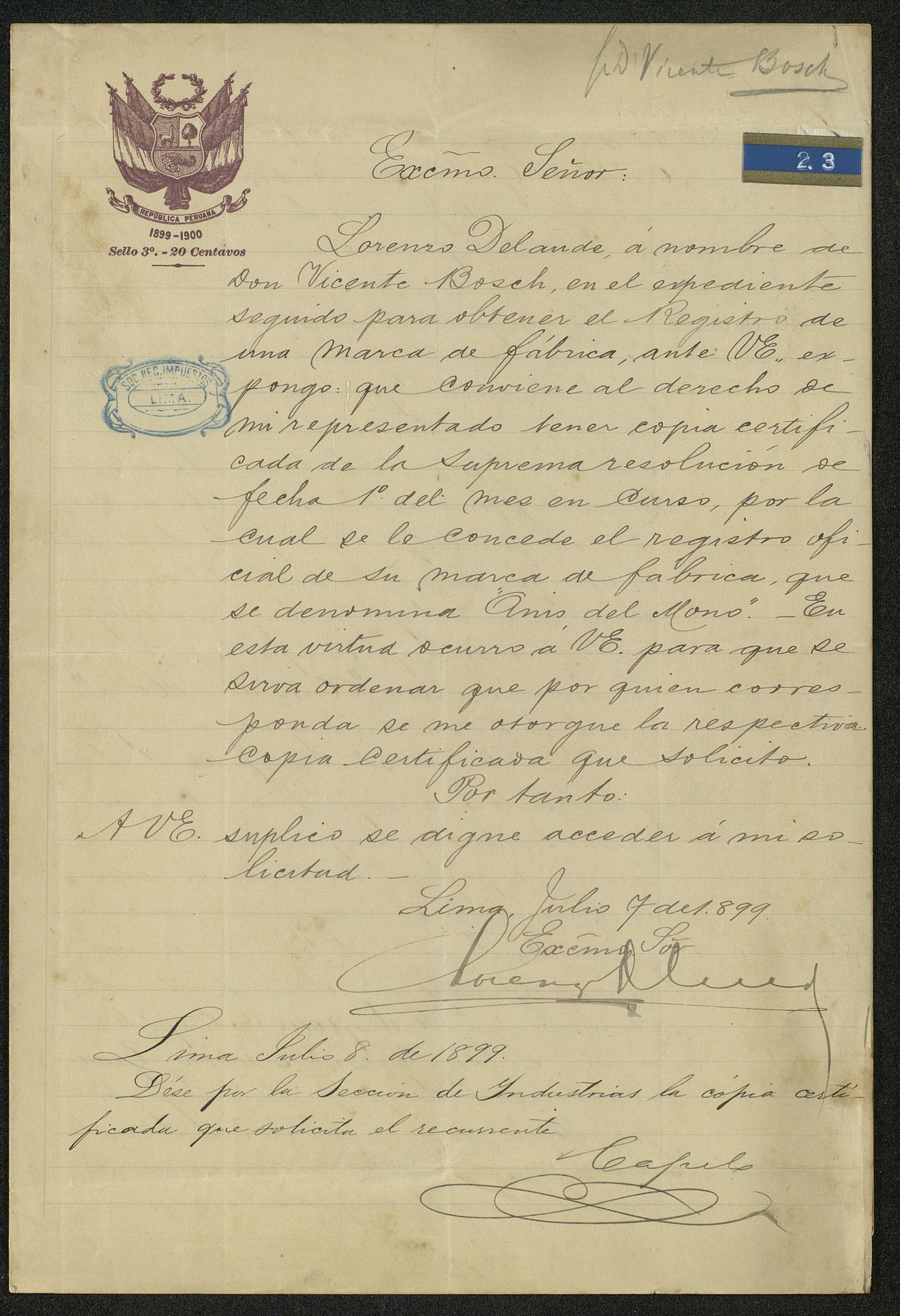 Registro de la marca Anís del Mono en Lima (Perú) 1899