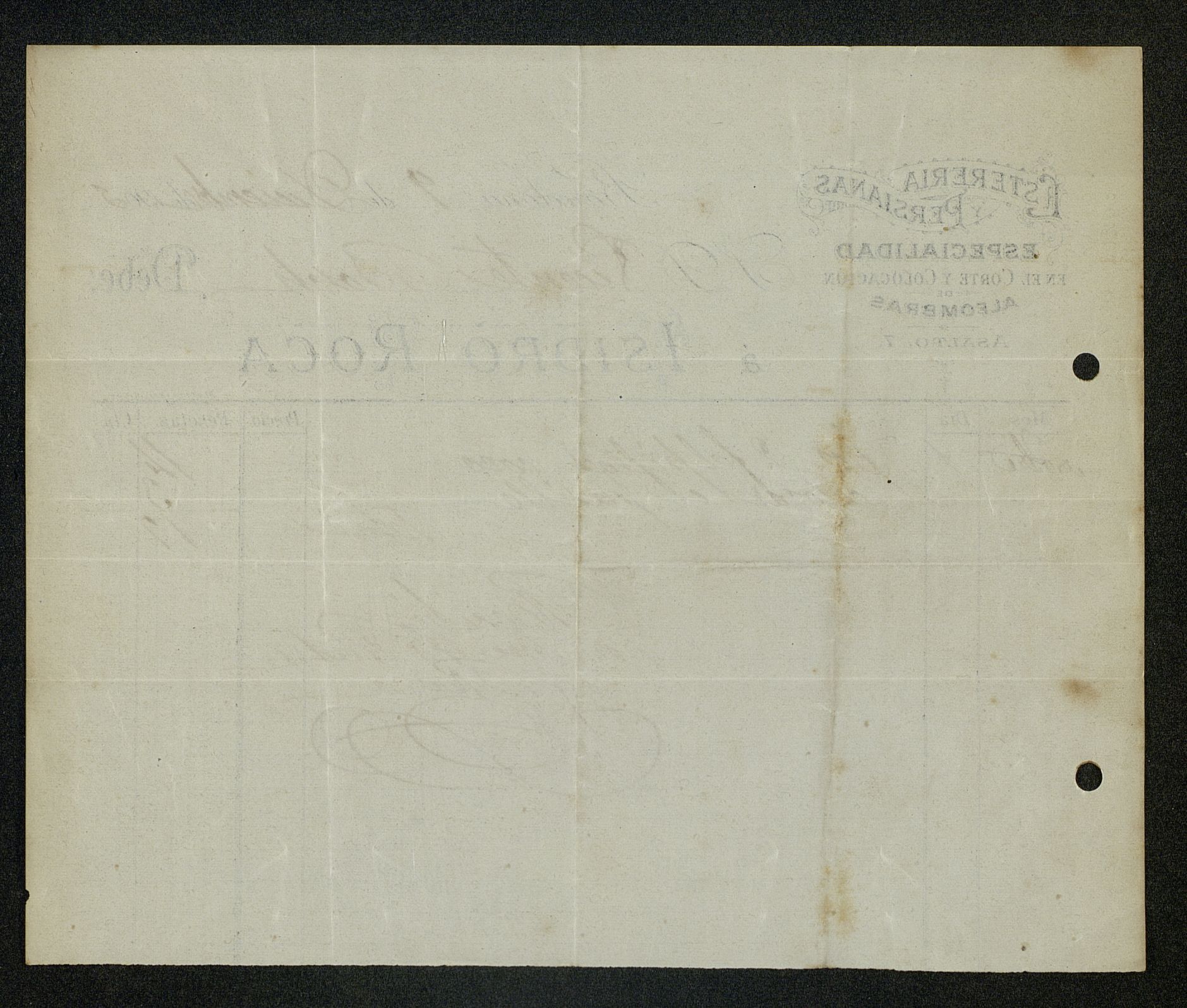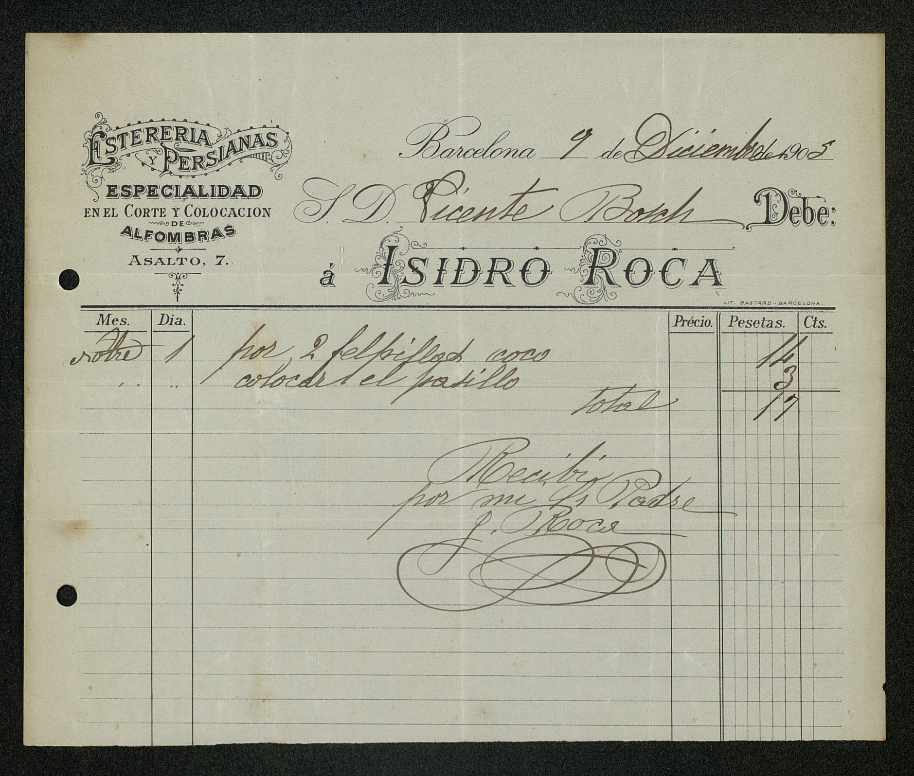 Factura, 1905, dic. 09 de Esterería y Persianas Isidro Roca por 2 felpillas de coco colocadas en el pasillo