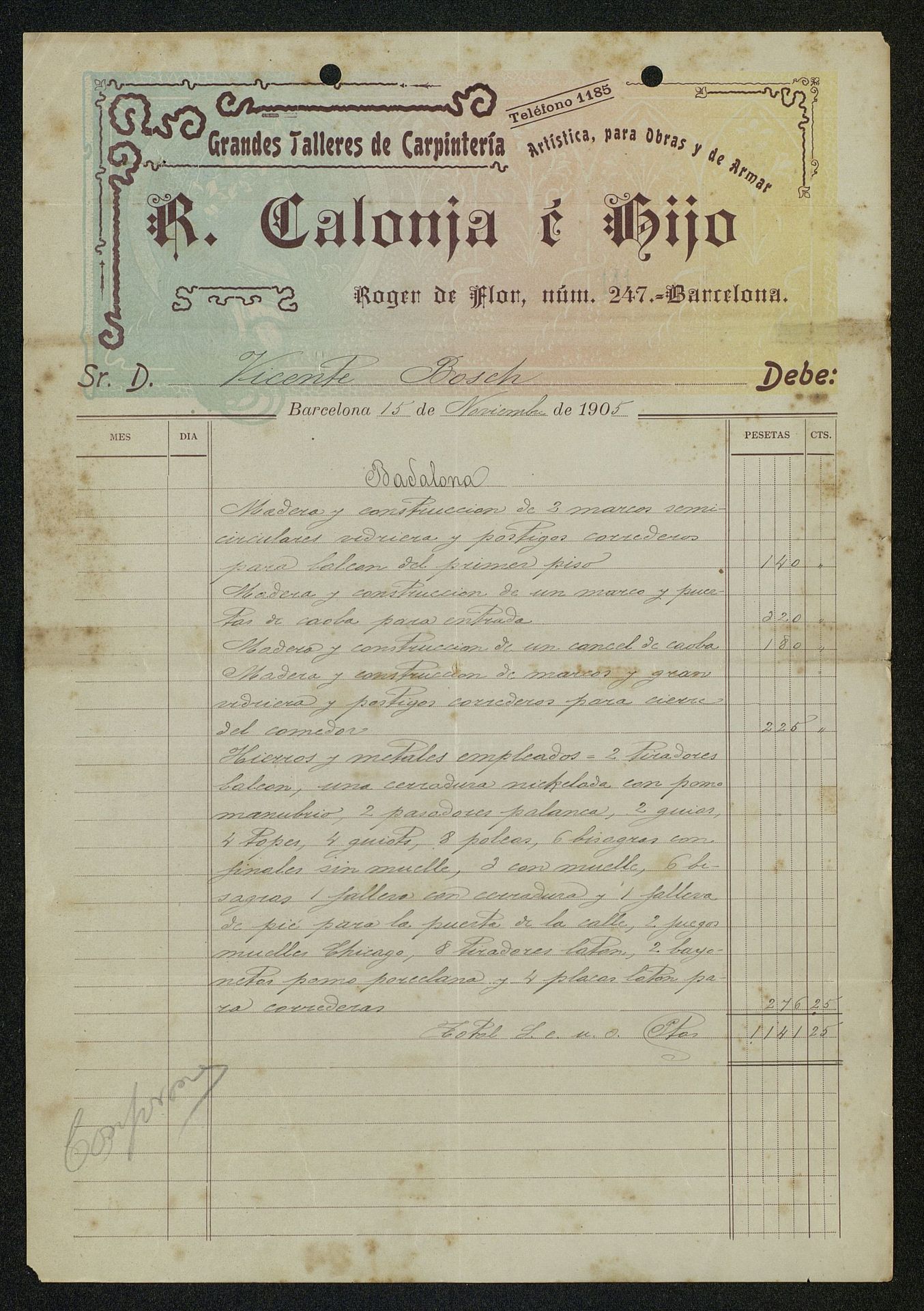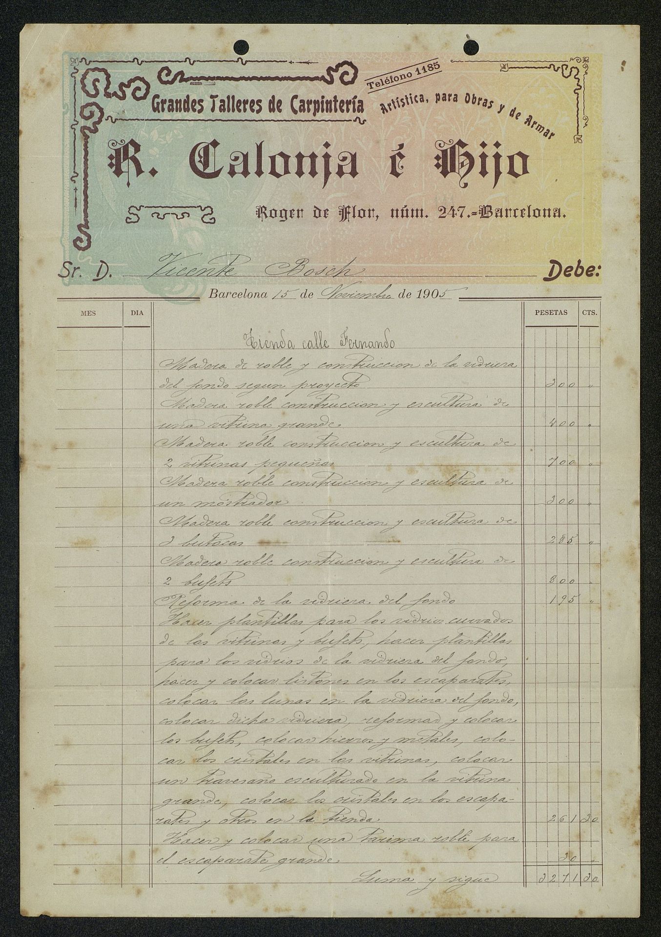 Factura de R.Calonja e Hijos grandes talleres de carpintería