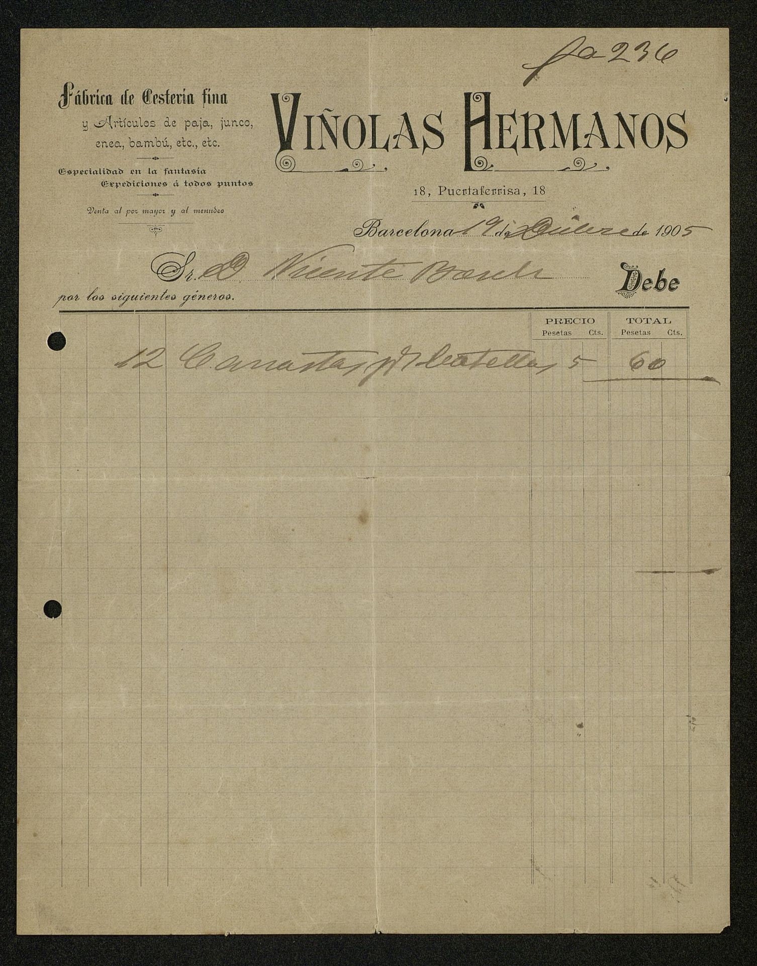 Factura nº 236, 1905, dic. 19 de Viñola Hermanos Fábrica de Cestería Fina por varios materiales