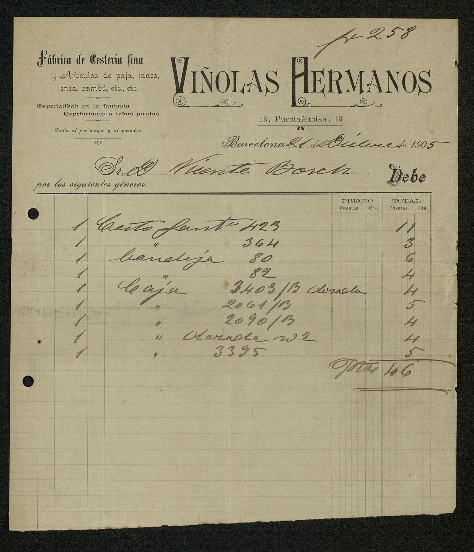 Factura nº 258, 1905, dic. 21 de Viñola Hermanos Fábrica de Cestería Fina por varios materiales