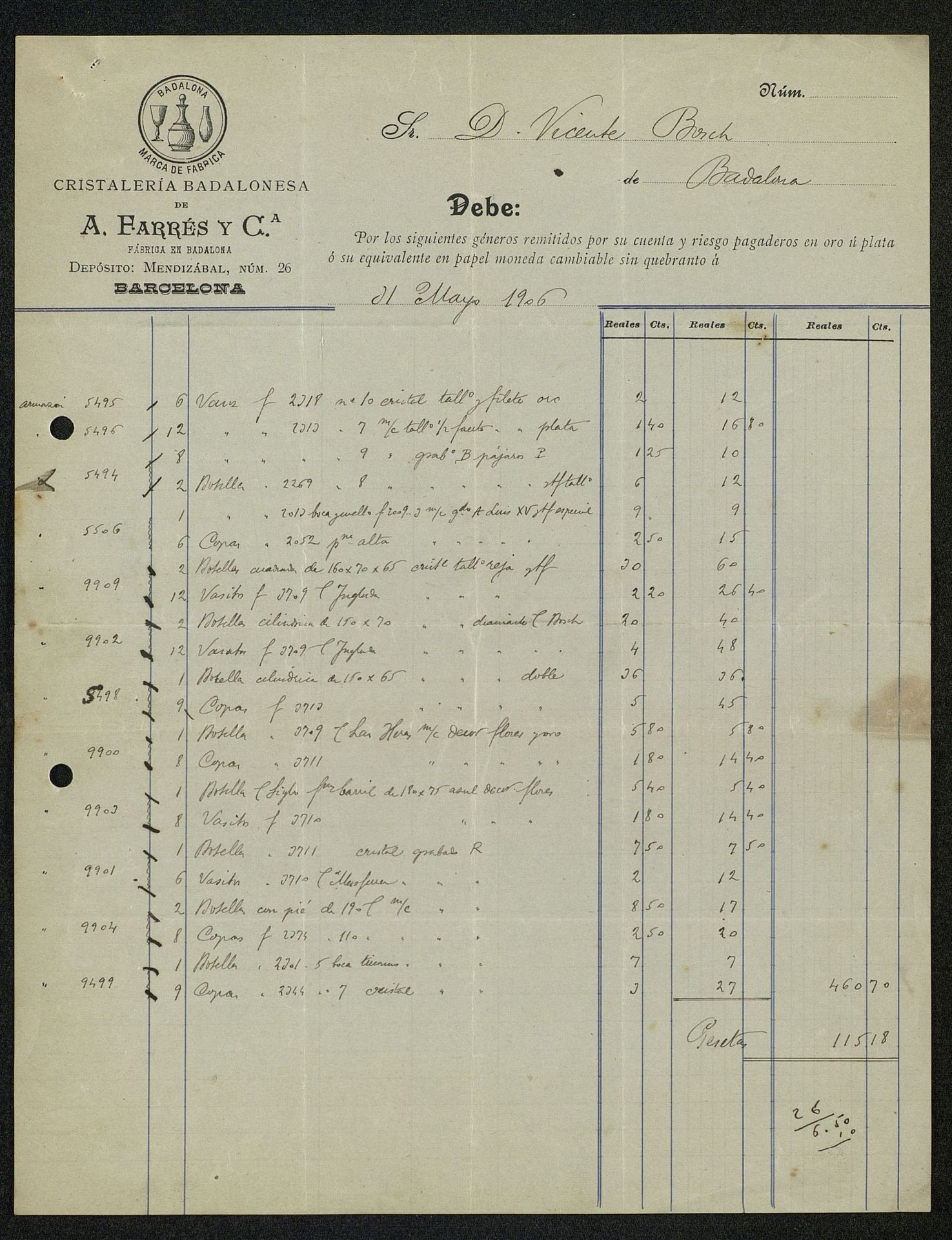 Factura, 1906, may. 31 de Cristalería Badalonesa de A. Farrés y Compañía por diveros materiales