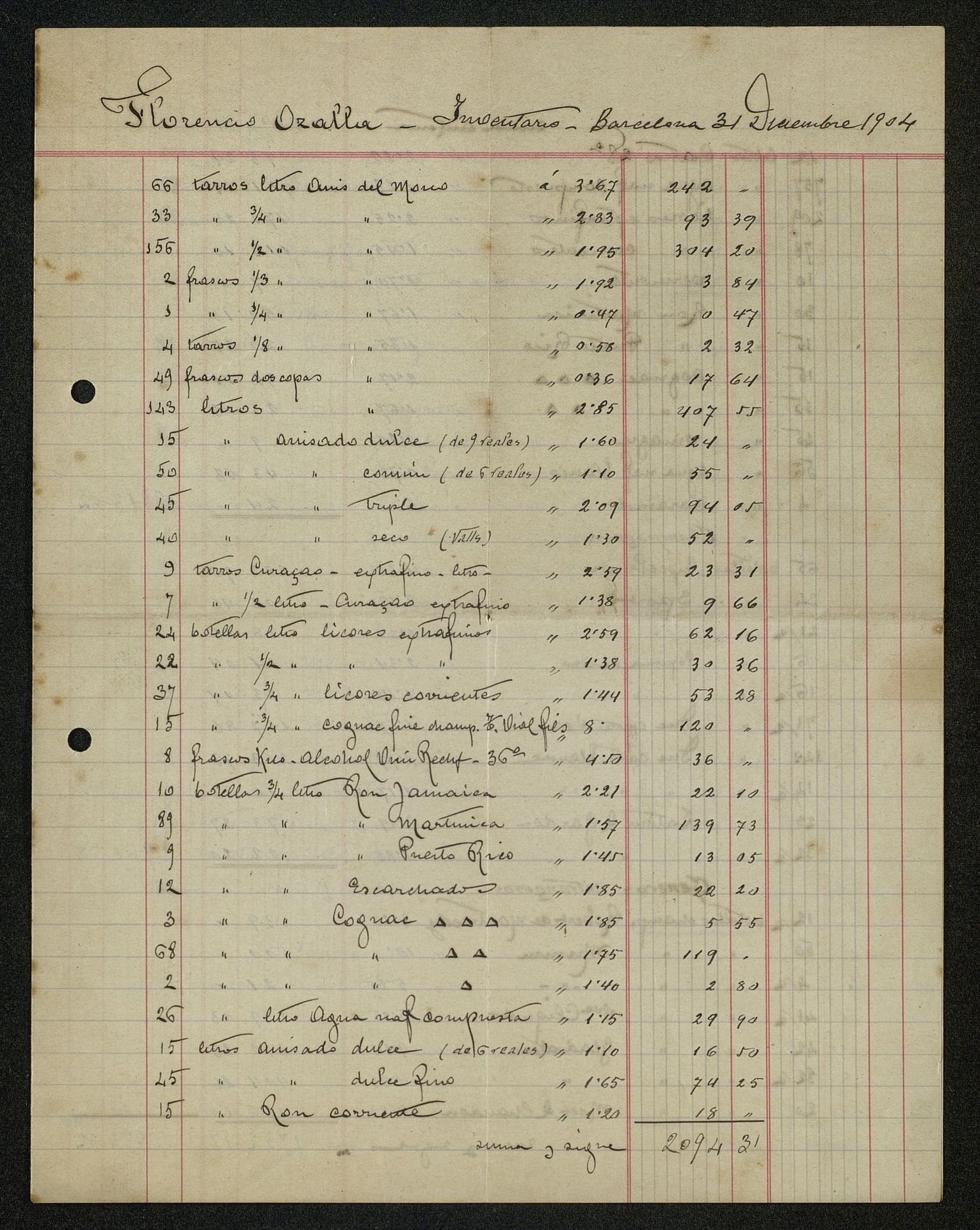 Inventario de Florencia Ozalla. Barcelona (Cataluña, España) 31 Diciembre 1904 31121904