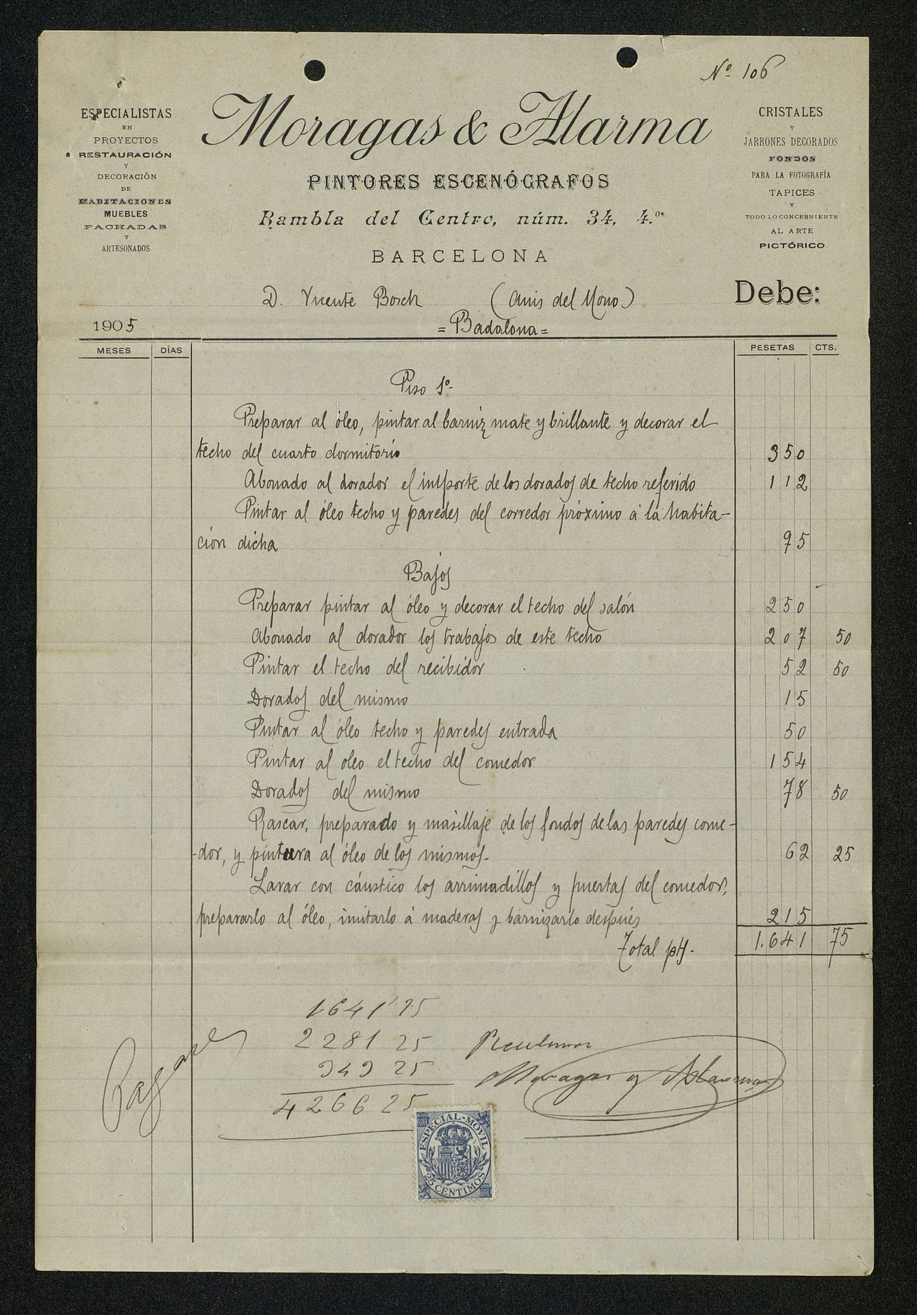 Factura 106 de Moragas y Alarma pintores escenógrafos
