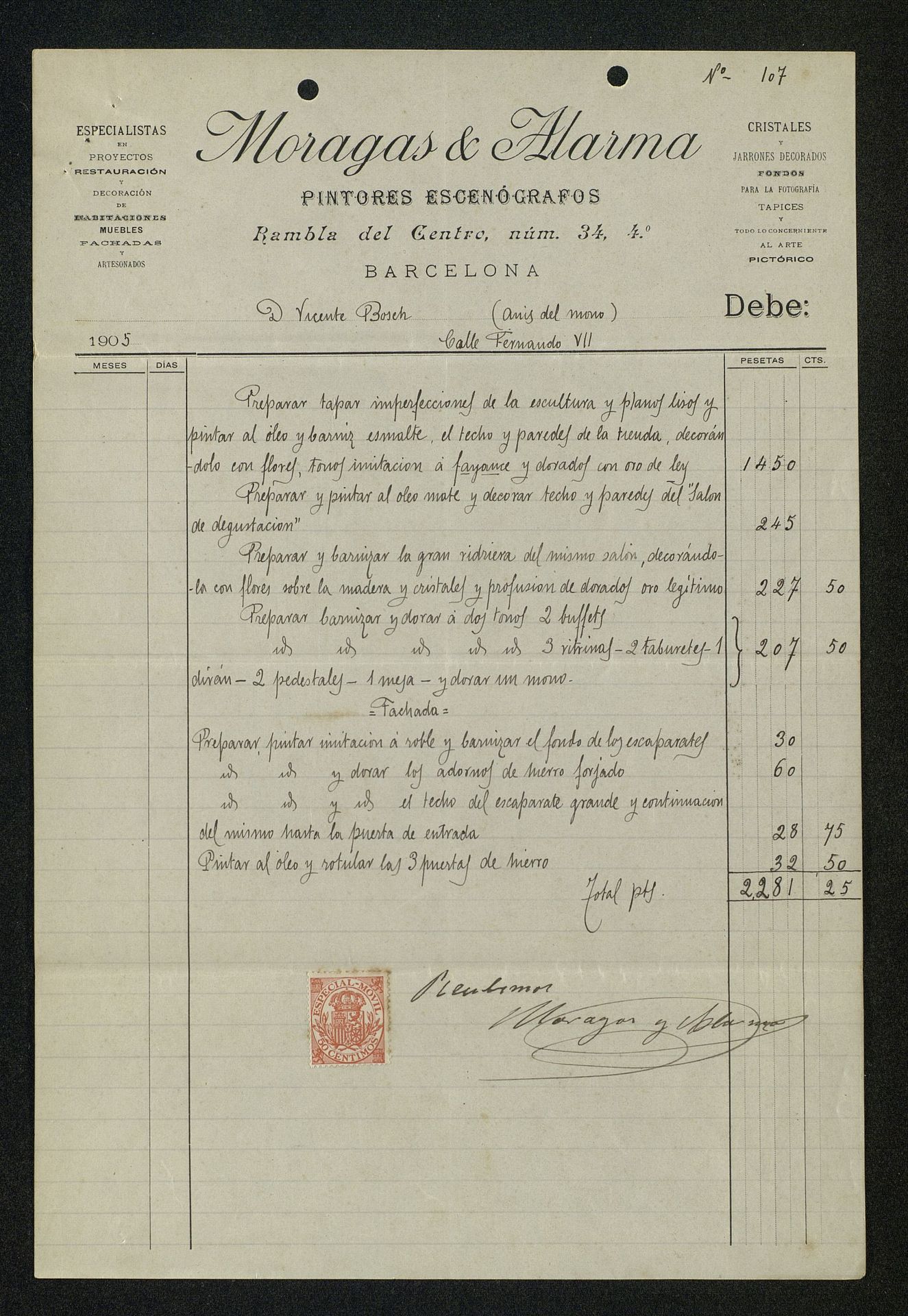 Factura 107 de Moragas y Alarma pintores escenógrafos
