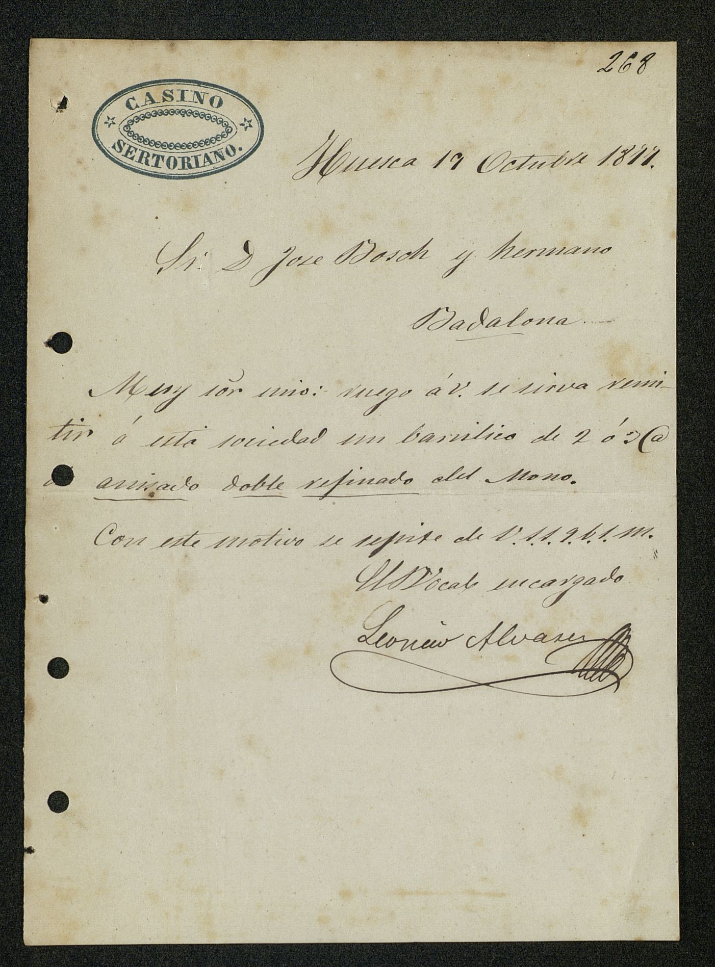 [Carta] 1877, oct.19, de Leoncio Álvarez a José Bosch en la que encarga 2 ó 3 arrobas de Anisado doble refinado del Mono