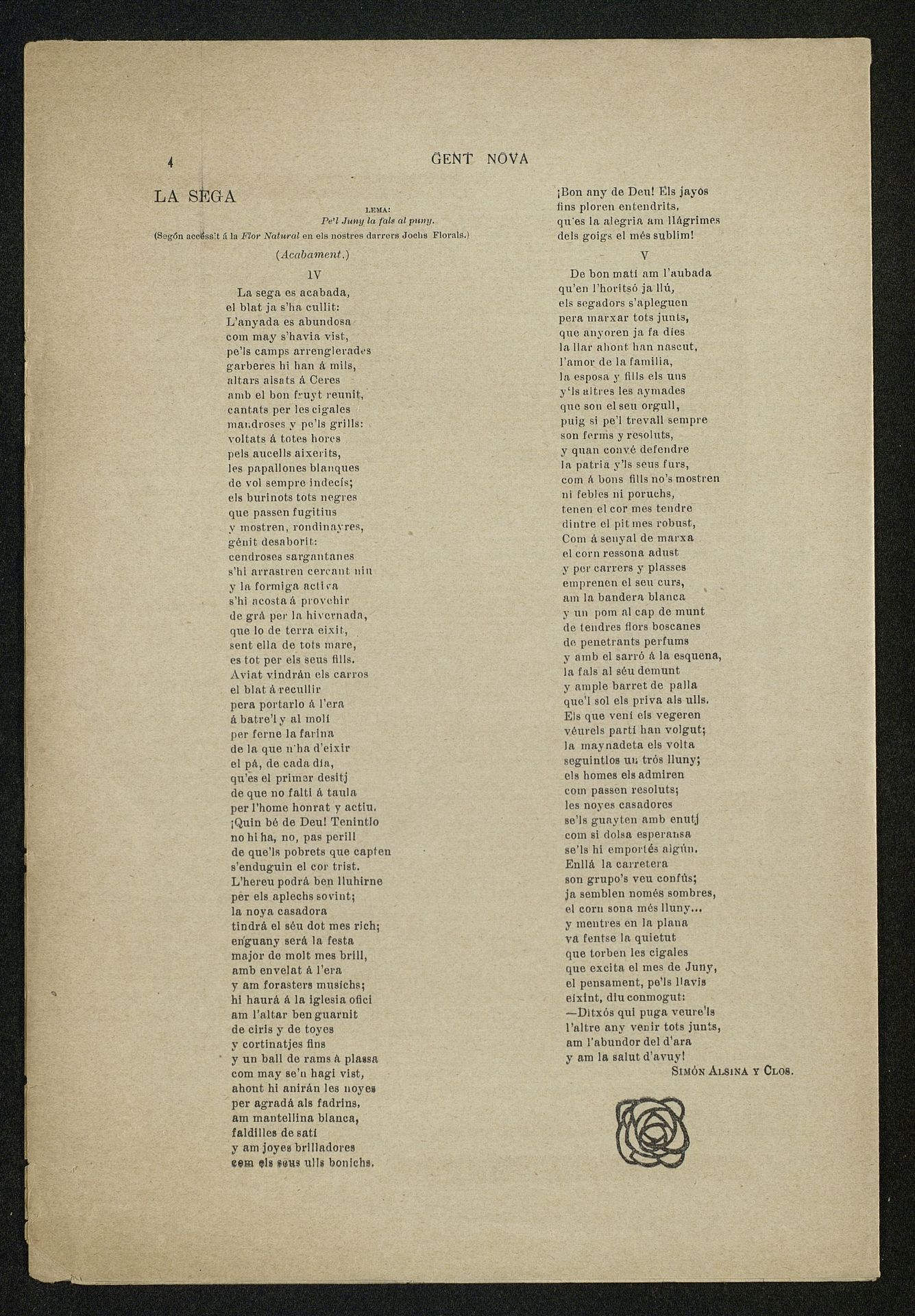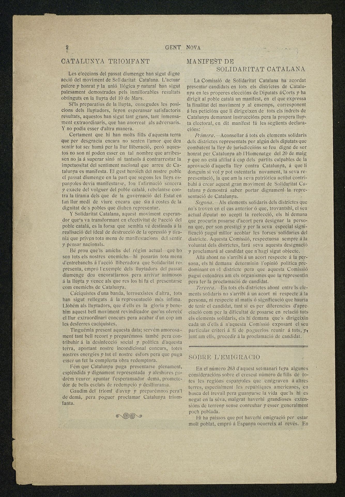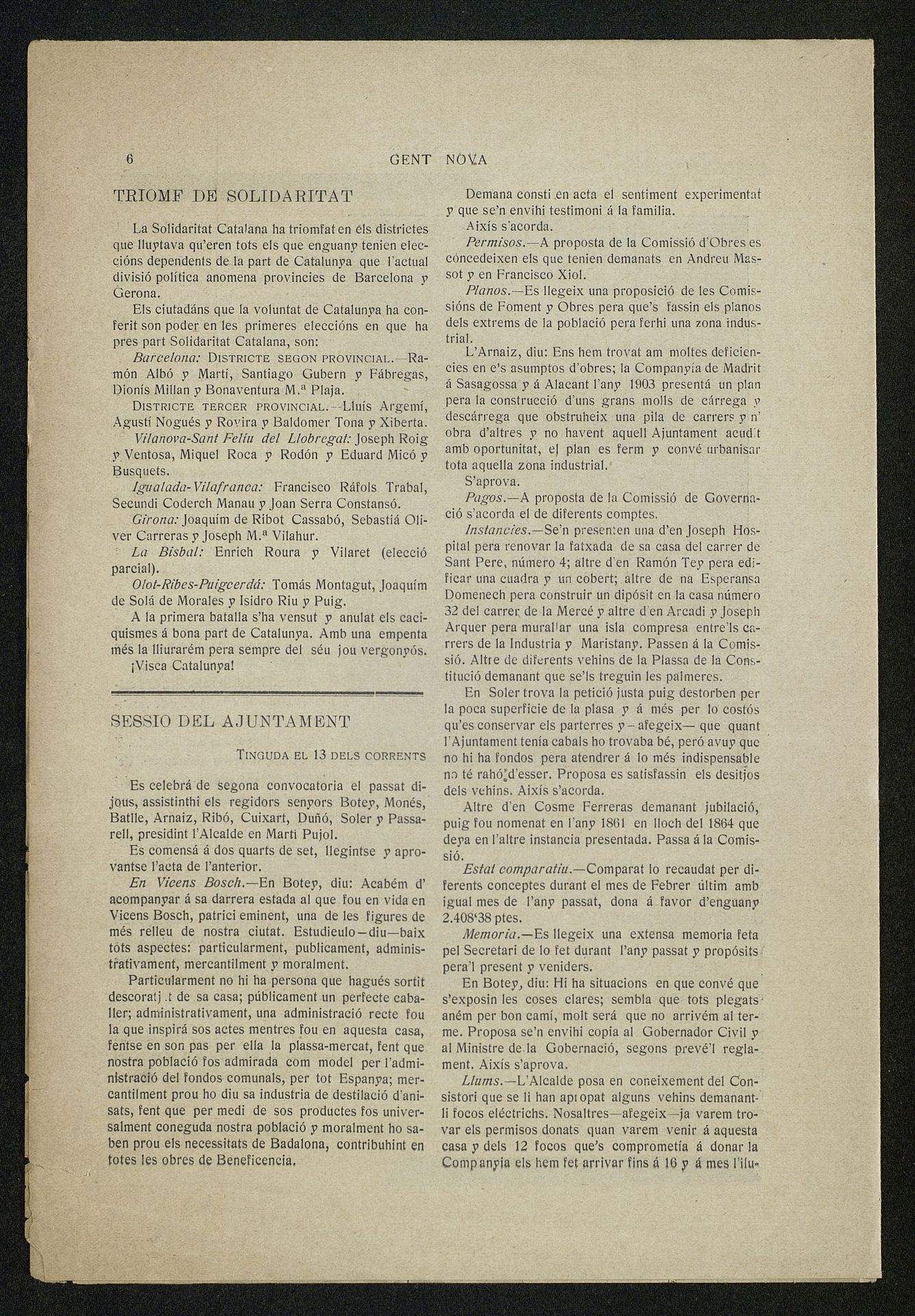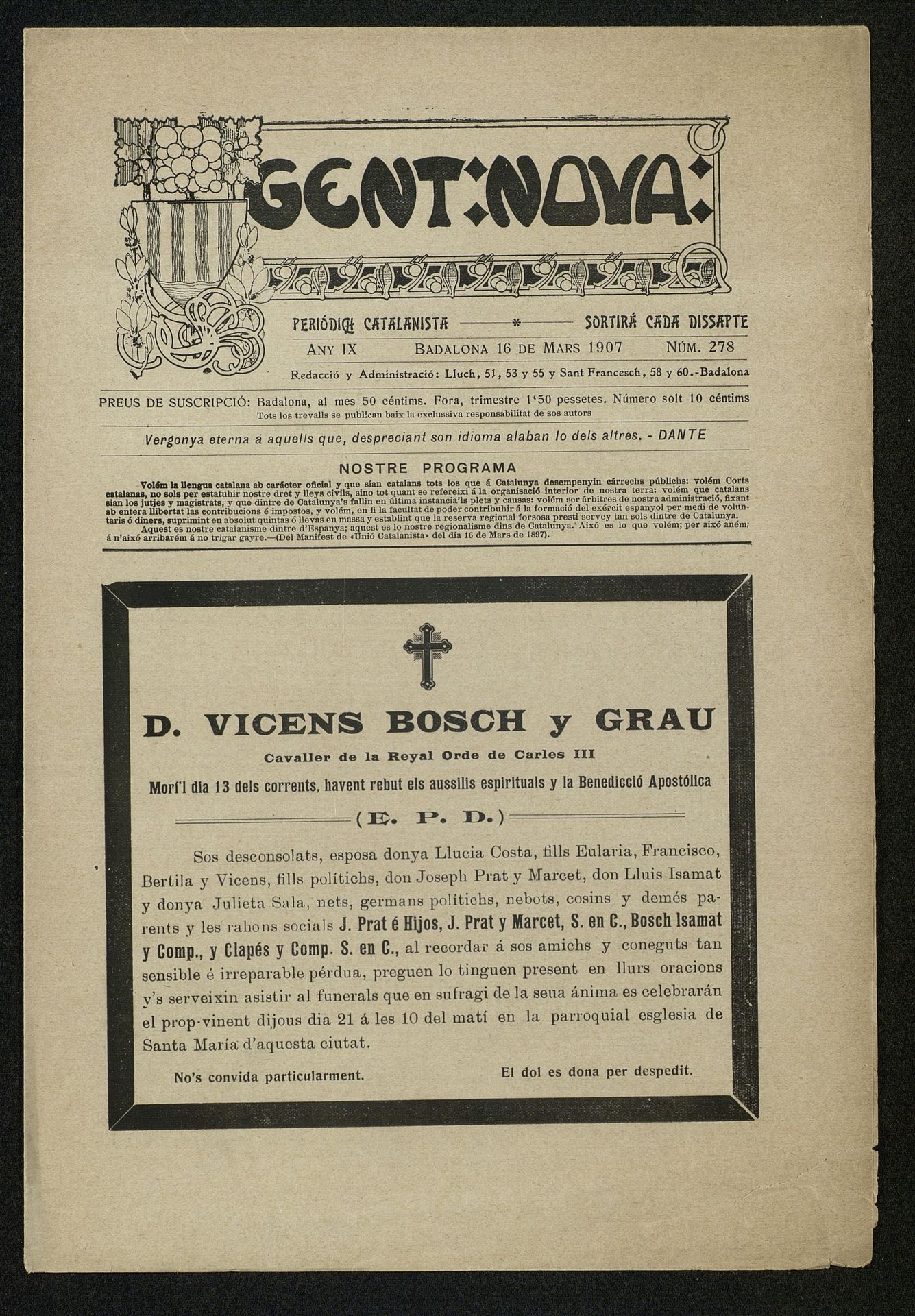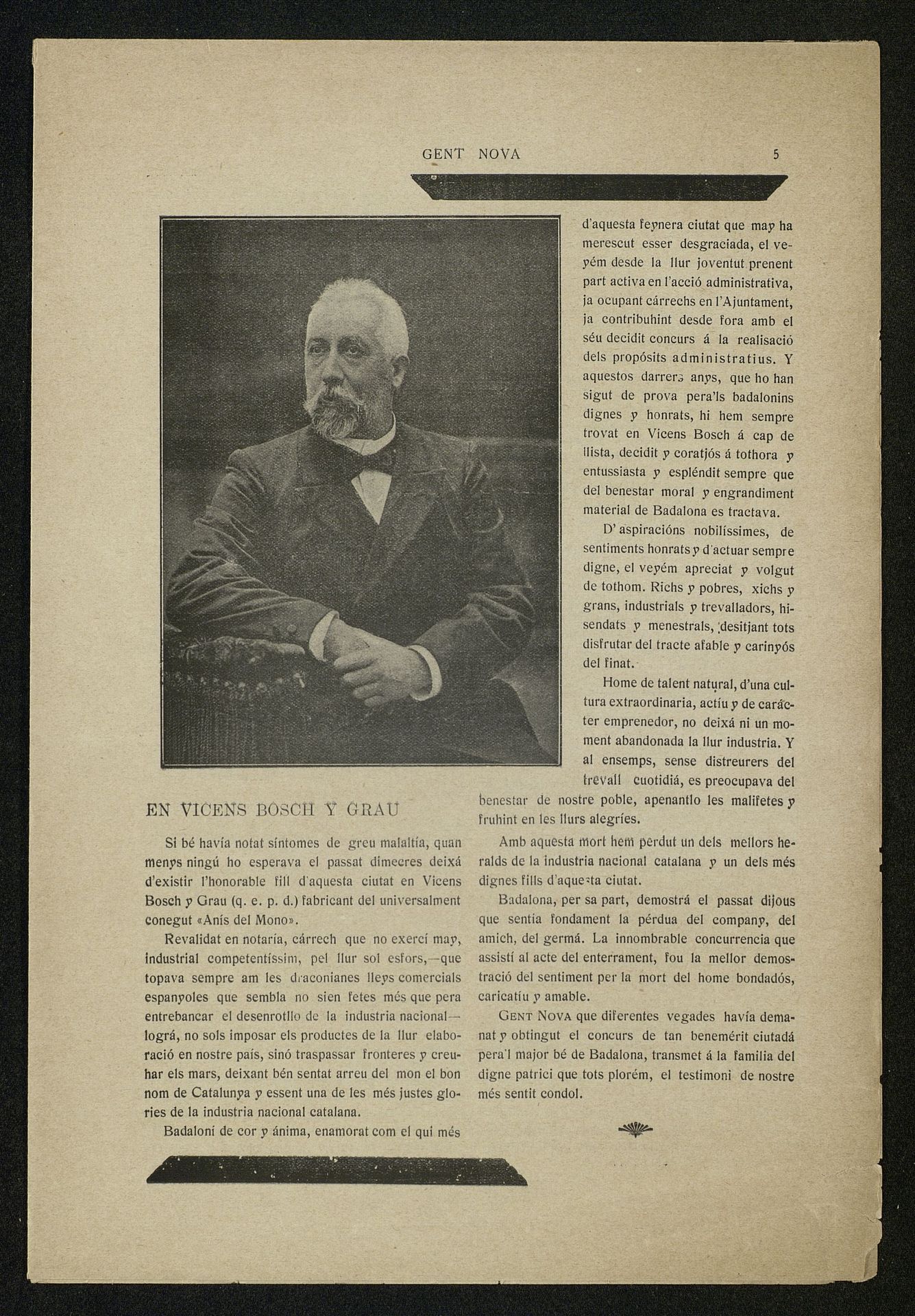 Publicación de la esquela de Don Vicente Bosch y Grau en Diario Gent Nova con semblanza en catalán