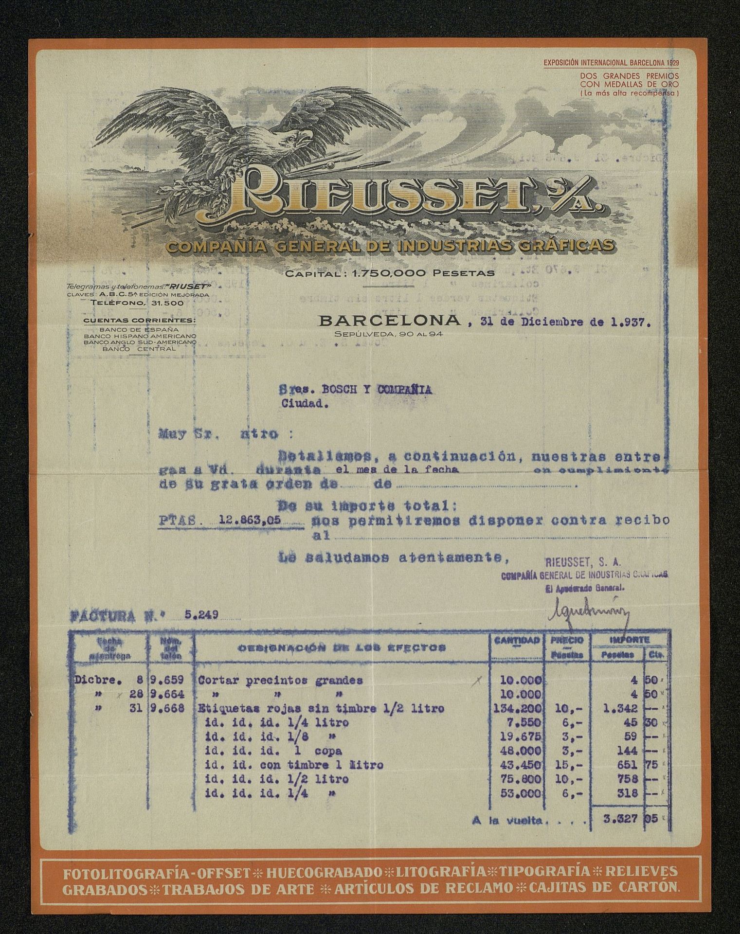 Albarán de entrega de Rieusset, S.A. Compañía General de Industrias gráficas por etiquetas rojas