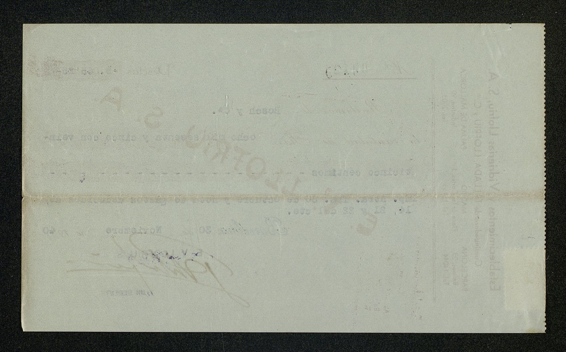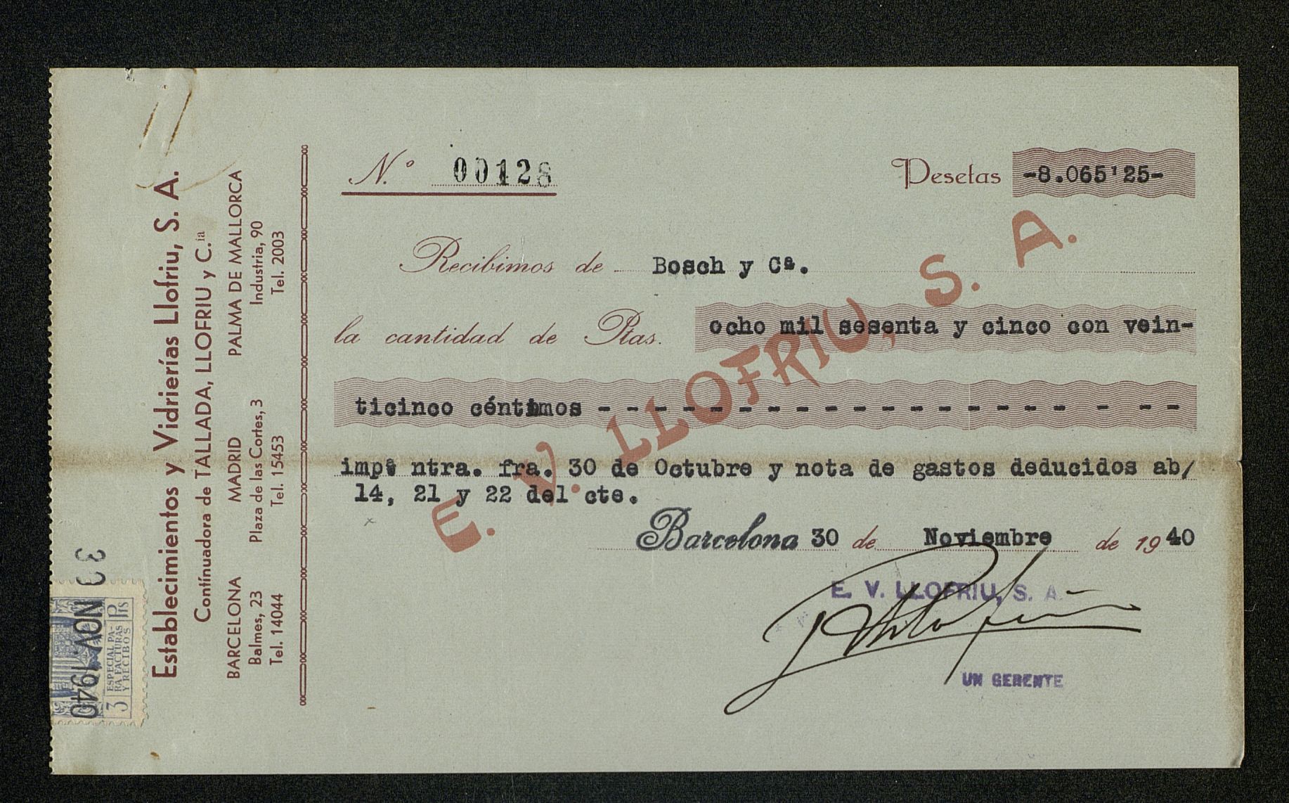 Factura y Recibo del pago de Establecimientos y Vidrieras Llofriu S.A. por 6.900 tarros labrados para Anís de 1000 grs