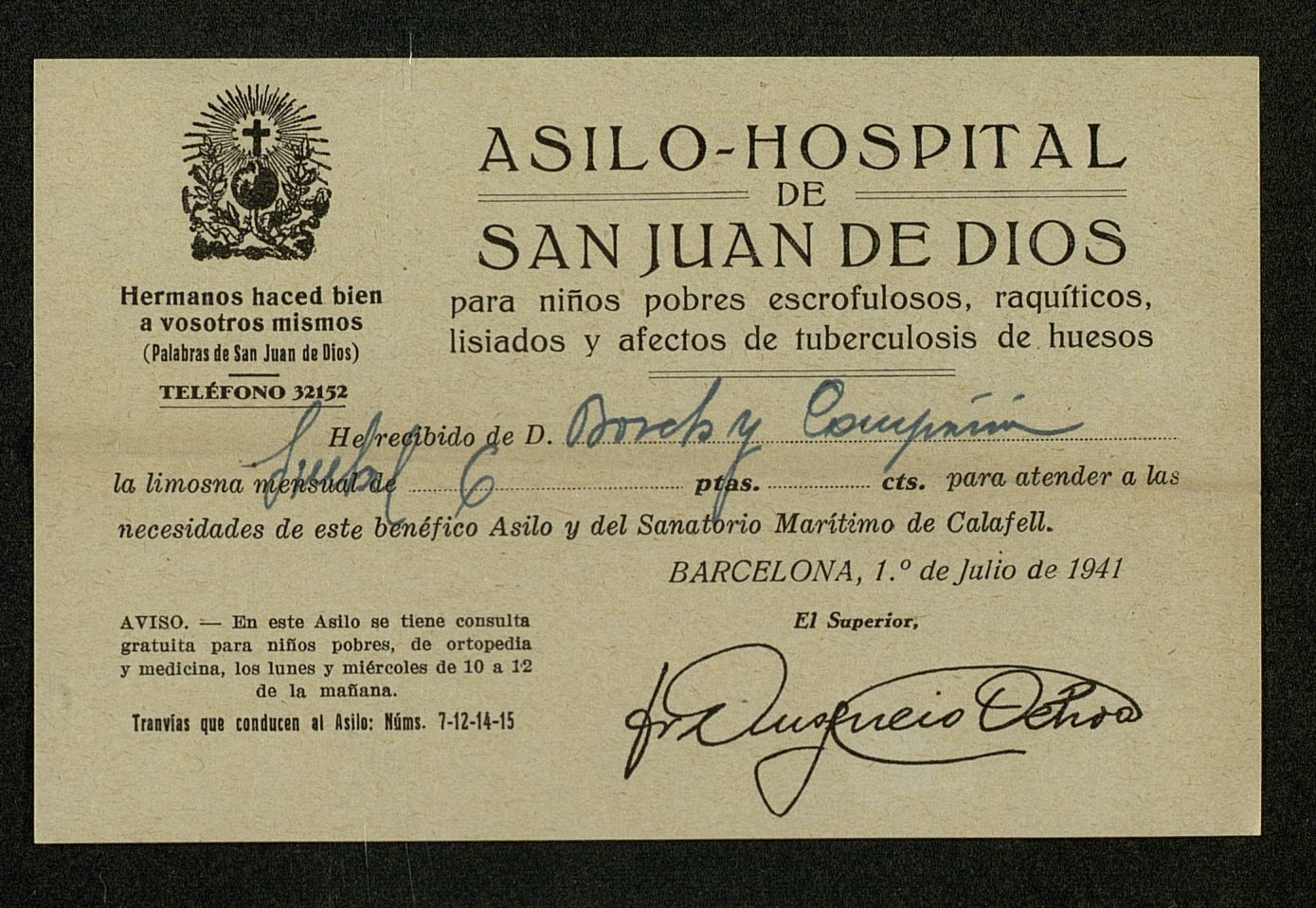 Recibo del Asilo-Hospital de San Juan de Dios por donativos de Bosch y Compañía