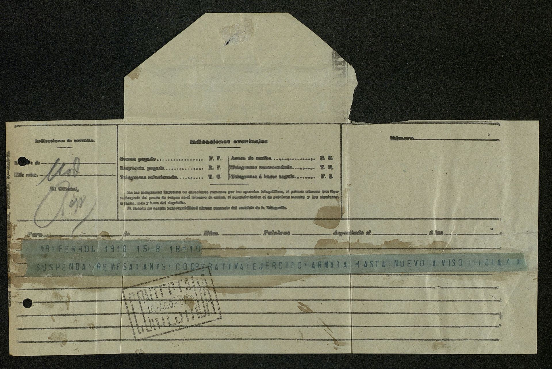 Telegrama solicitando anulación de remesa para la Cooperativa Ejército Armada (muestra de ser proveedores del Ejército)