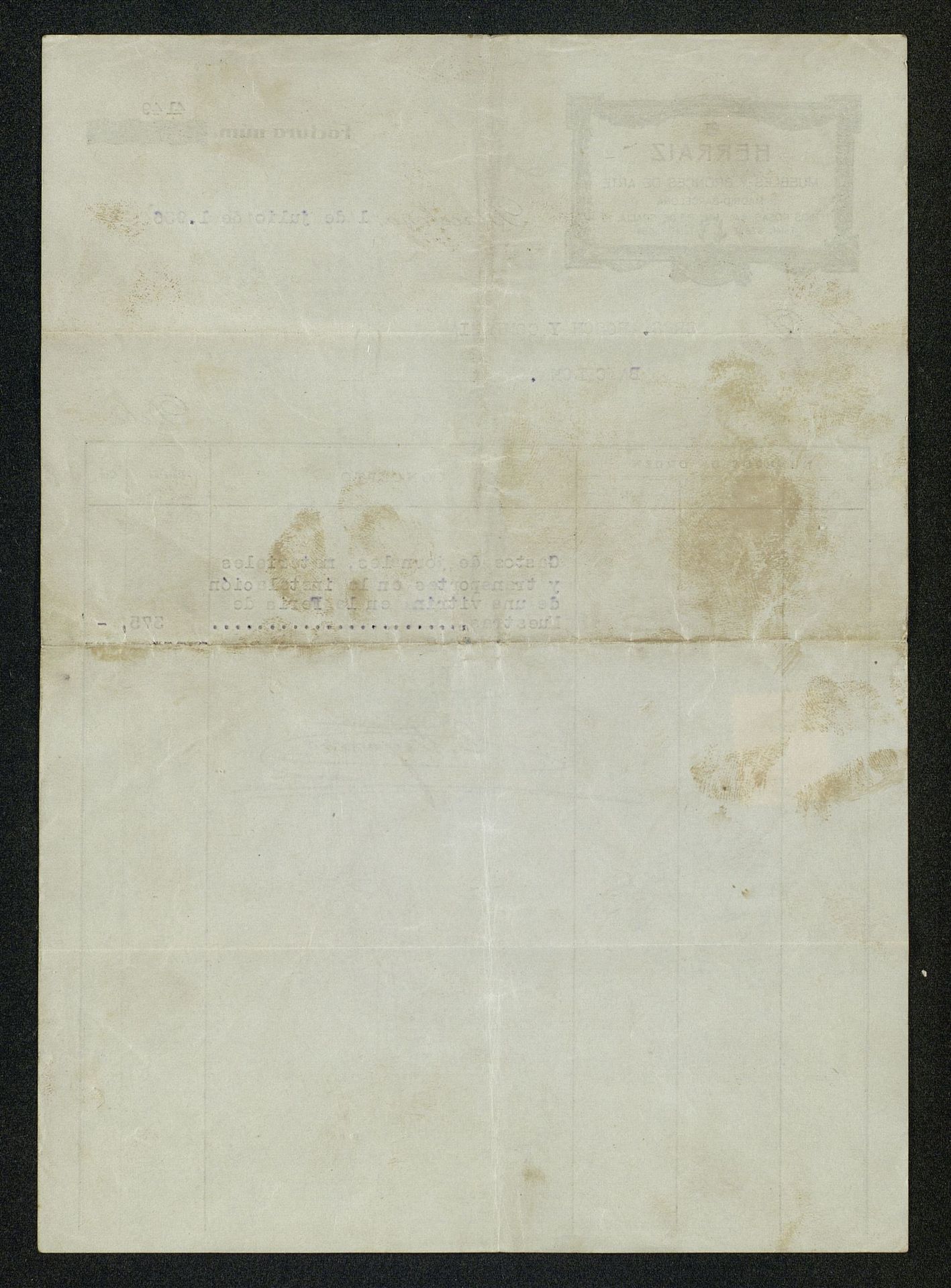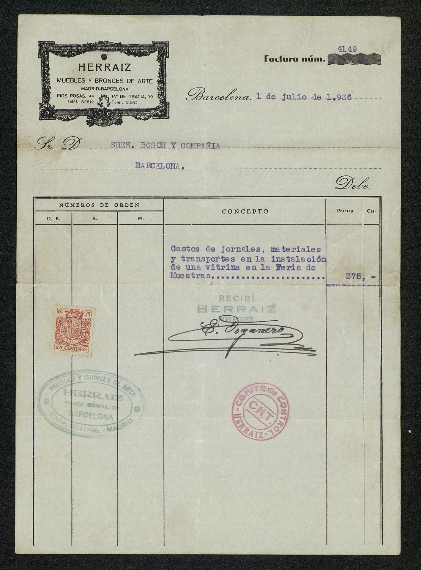 Factura de Herráiz Muebles de Bronce y Arte por gastos de jornales, materiales y transporte de vitrina en la Feria de Muestras de Barcelona (Cataluña, España) de 1936