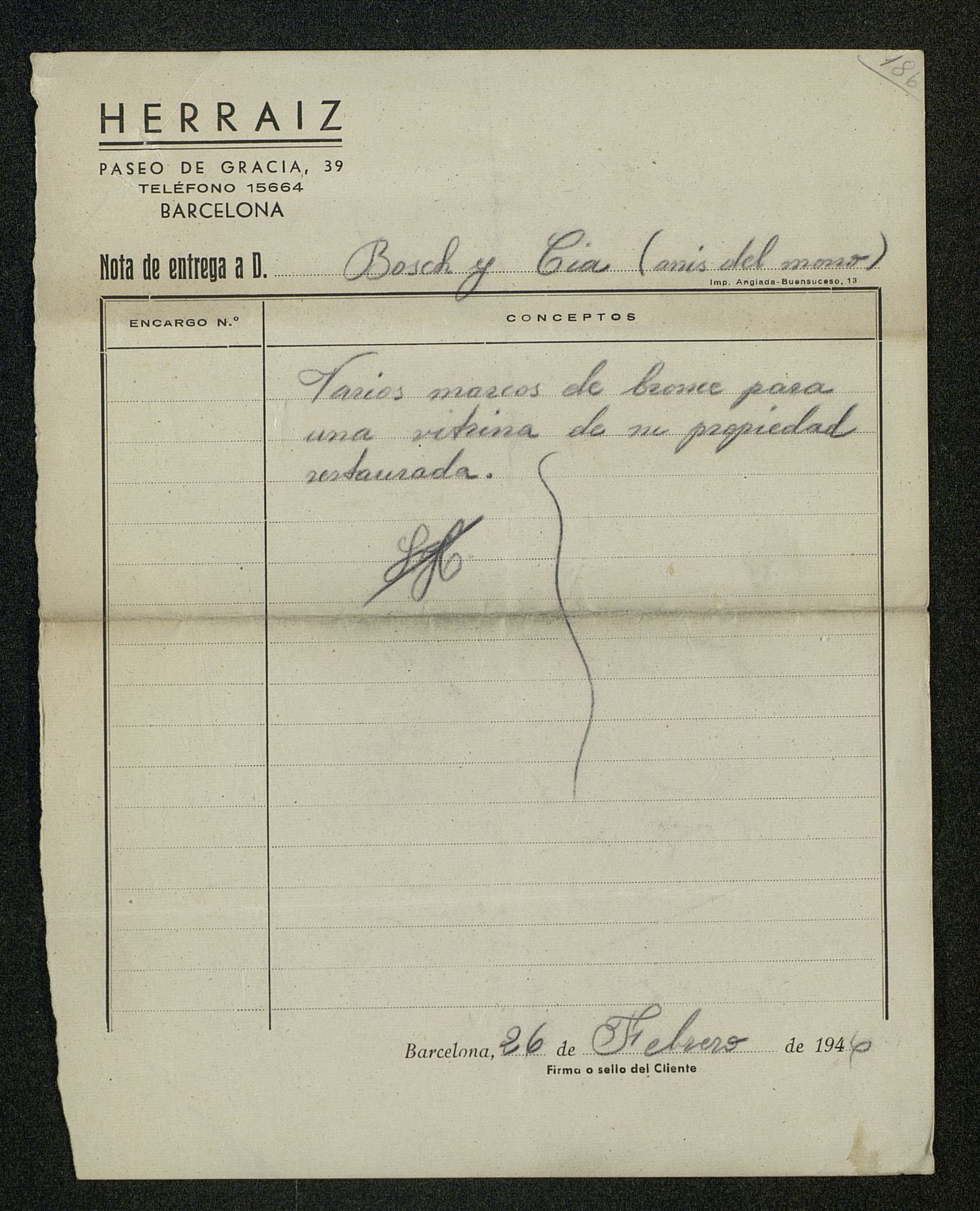 Nota de entrega de la restauración de varios marcos de bronce de la vitrina Anís del Mono