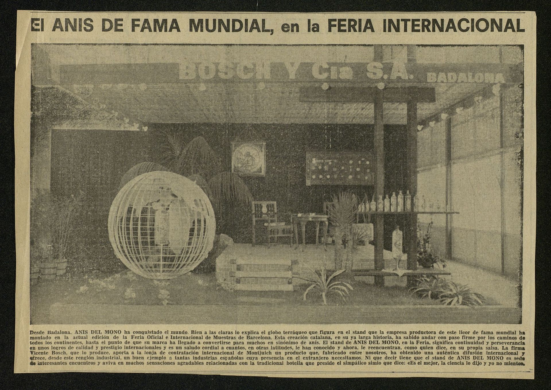 Stand de Anís del Mono en Exposición de Barcelona (Cataluña, España) y 3 anuncios prensa Anís del Mono vinculado el deporte. Recortes de prensa