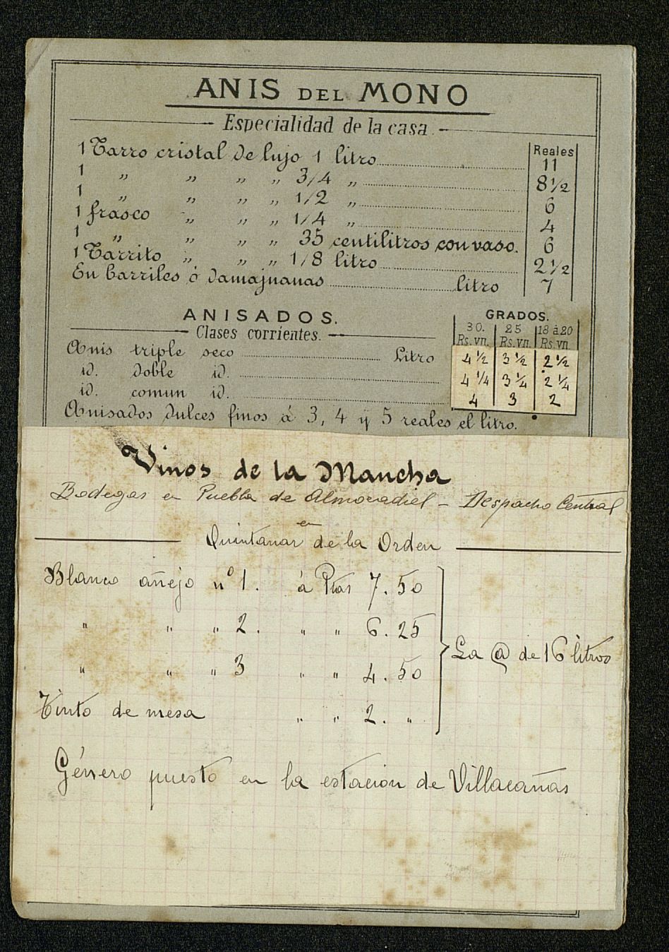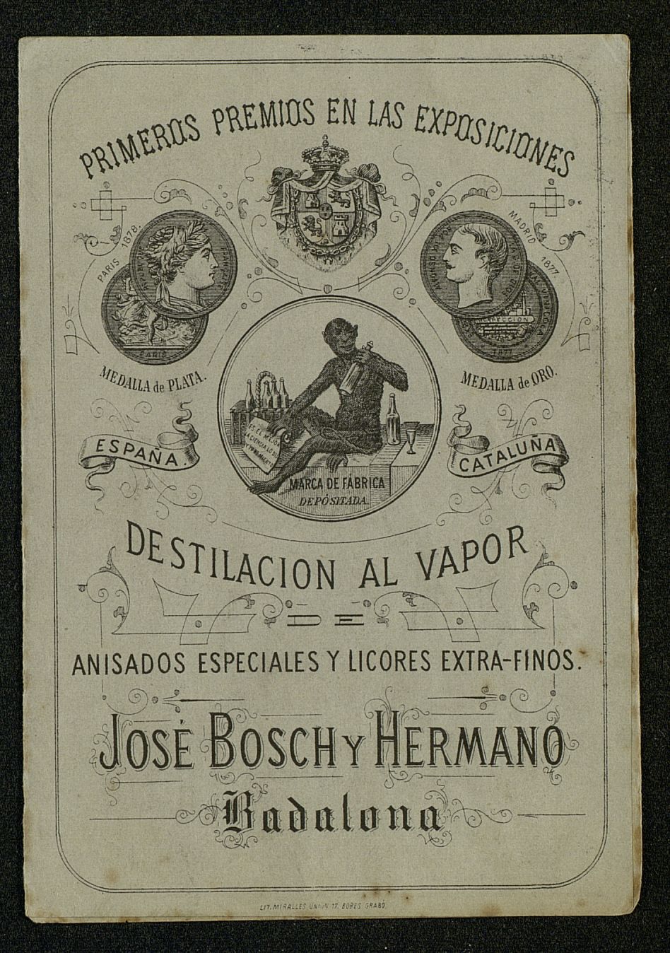 Tarjeton gris doble cara con : Primeros premios en las exposiciones. Destilación al vapor. Anisados especiales y licores extra-finos. José Bosch y Hermano, Badalona (Cataluña, España) Interior con productos y precios