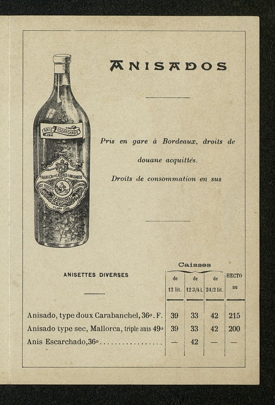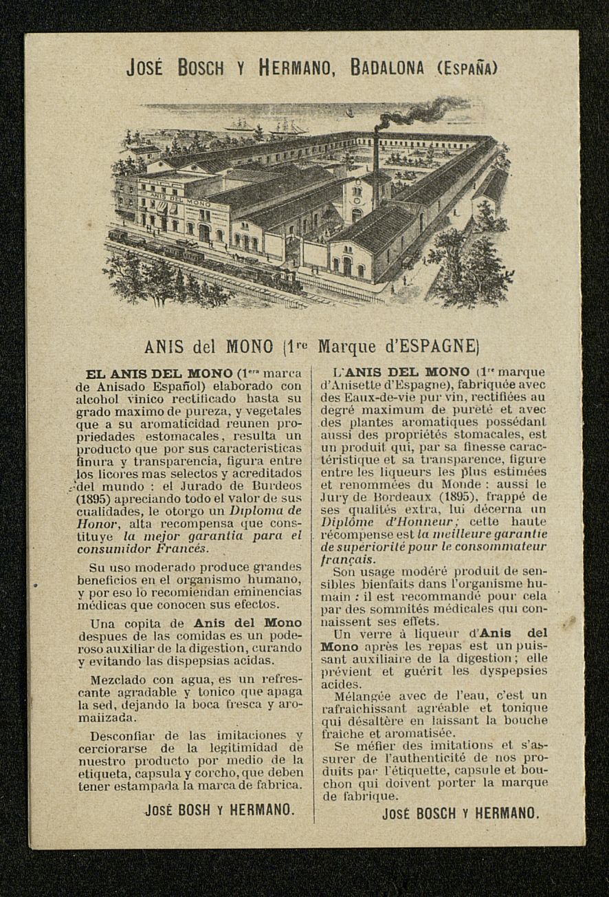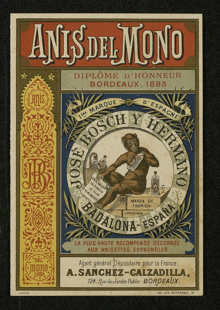 Agent gènèral depositaire pour la France = Agente comercial para Francia A. Sánchez-Calzadilla. Interior con listado de precios Anís del Mono. Diploma de honor Bordeux, 1895 [Díptico]