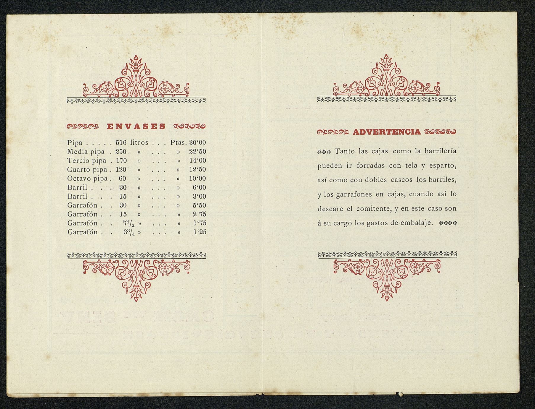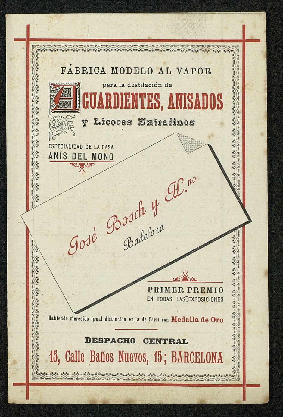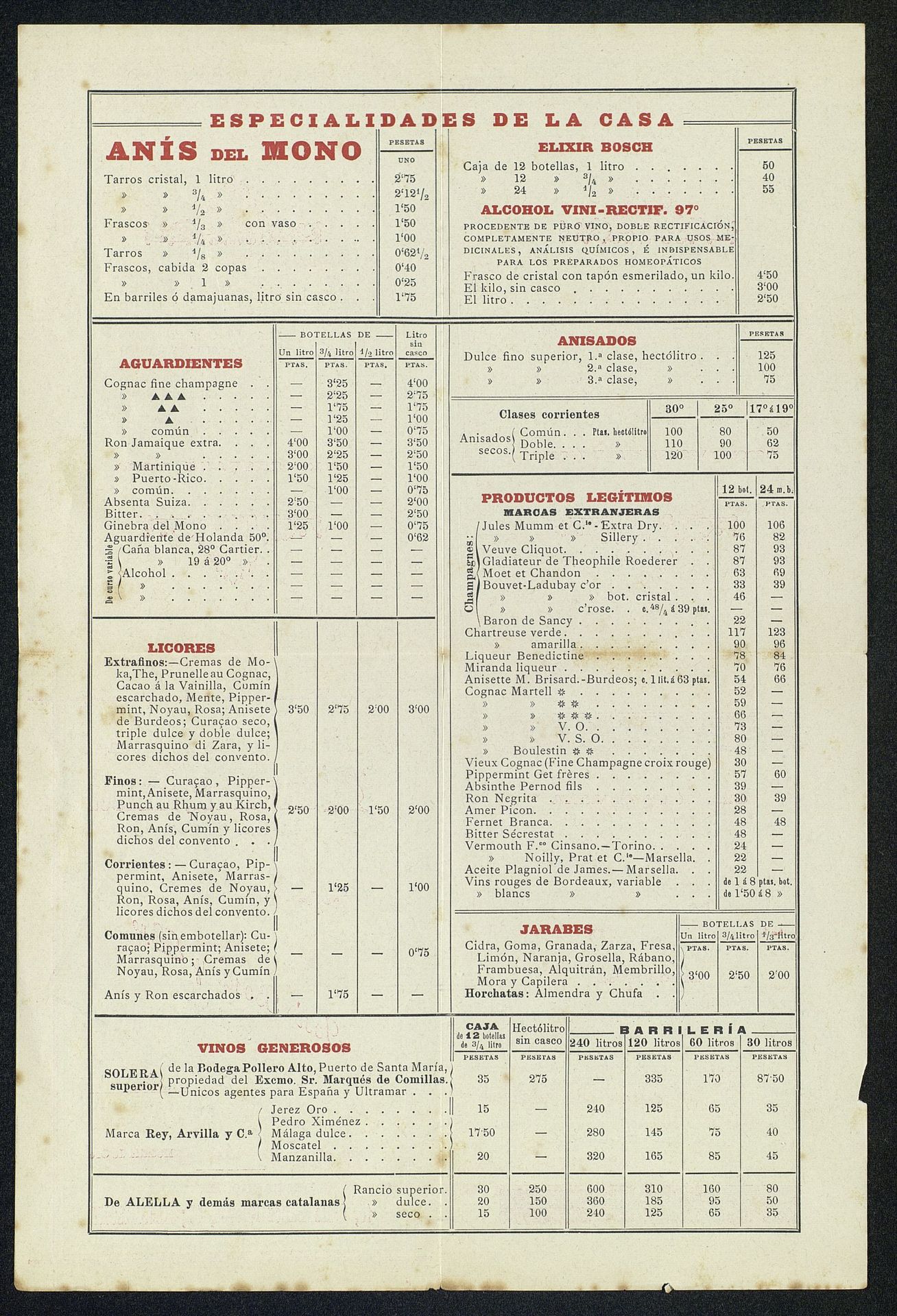 Fábrica modelo al vapor. Aguardientes, anisados y licores extrafinos. Primer premio en todas sus exposiciones, José Bosch y Hermano, Badalona (Cataluña, España) Interior con formatos y precios [Díptico]