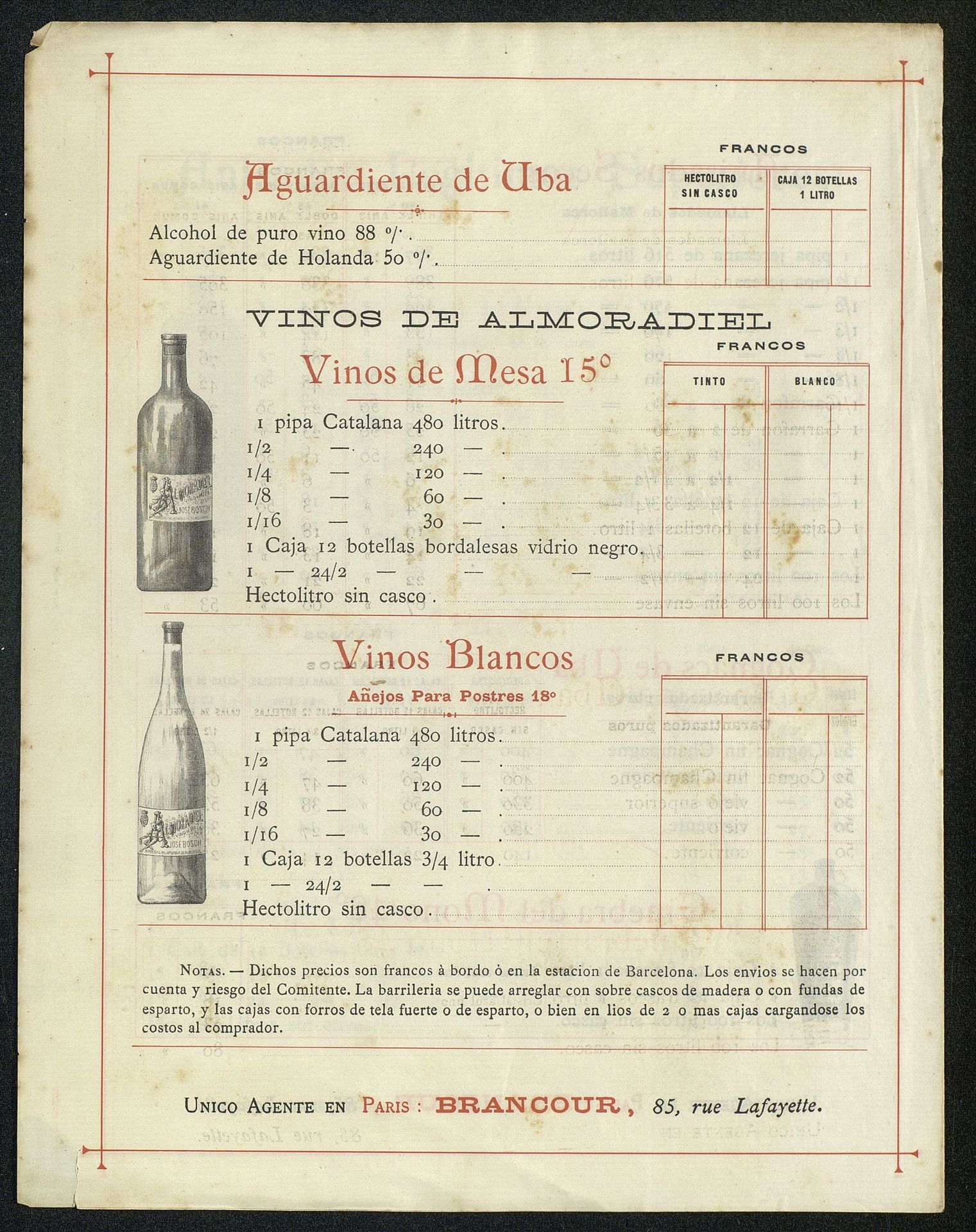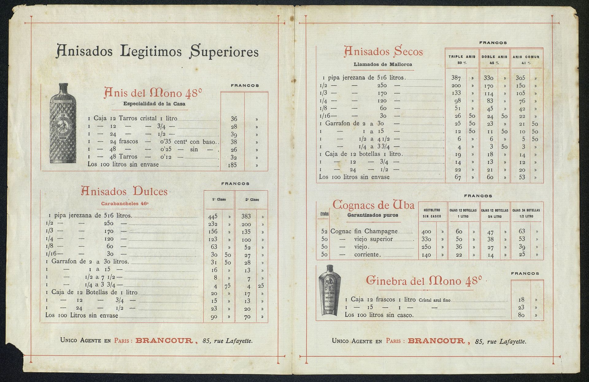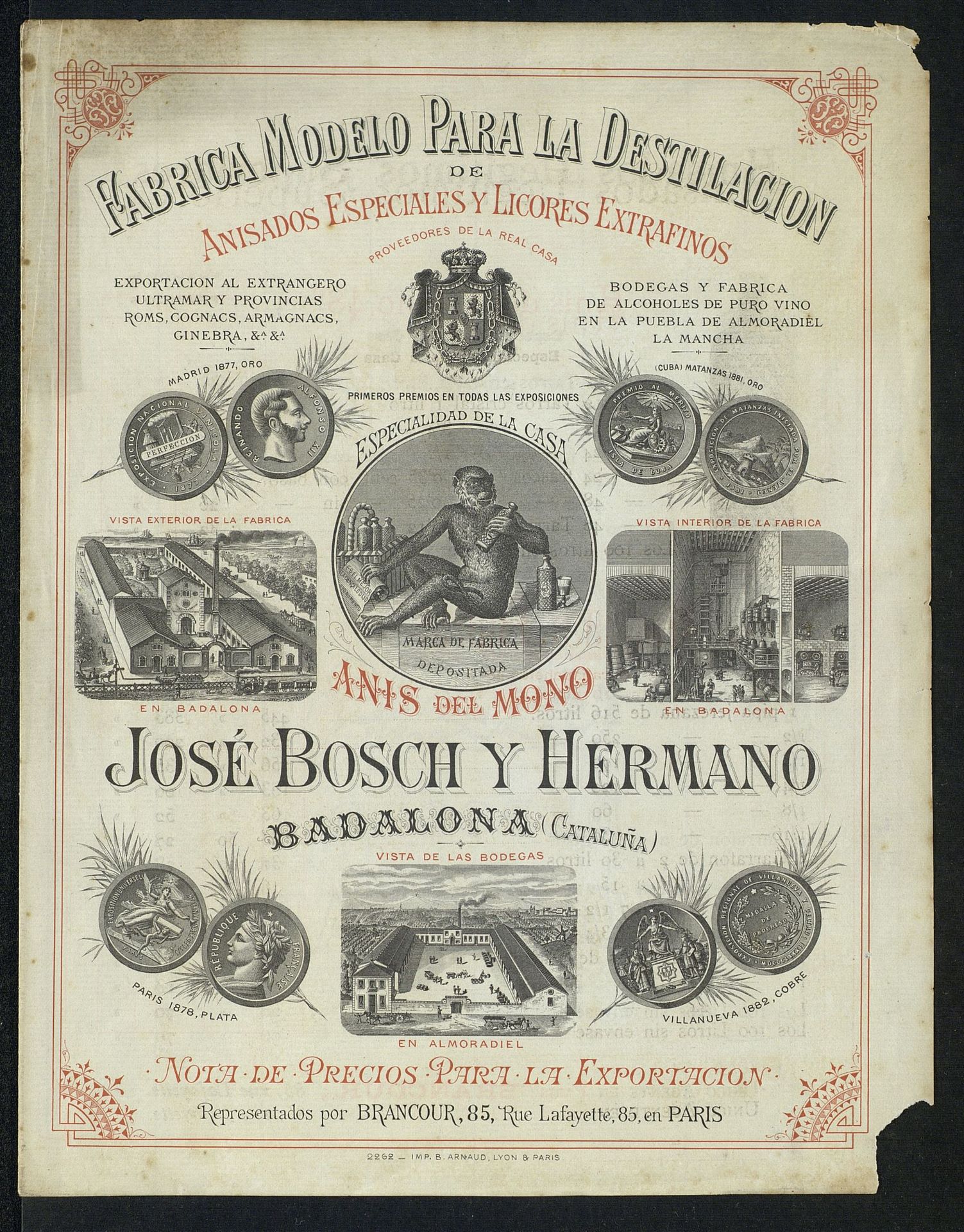 Precios para la exportación. Imagen de la Fábrica Anís del Mono. Modelo para la destilación de anisados especiales y licores extrafinos, José Bosch y Hermano. Proveedores de la Casa Real [Díptico]