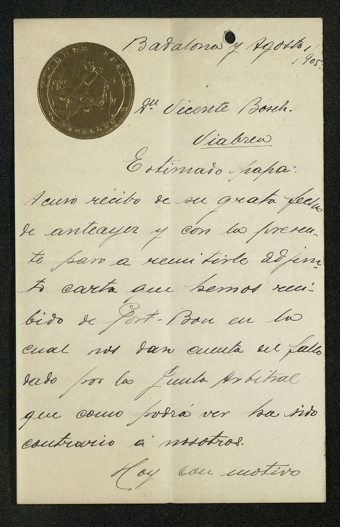 [Carta] con timbre dorado Anís del Mono de Paco (hijo de Vicente Bosch) a su padre Vicente Bosch