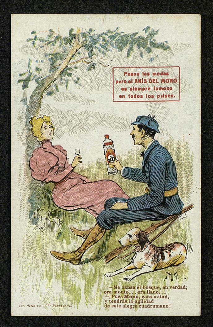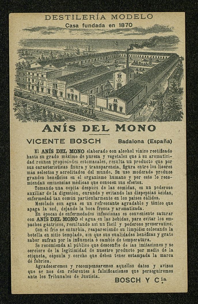 Pasan las modas pero el Anís del Mono es siempre famoso en todos los paises. Trasera con imagen fábrica y texto sobre Bosch y Compañía