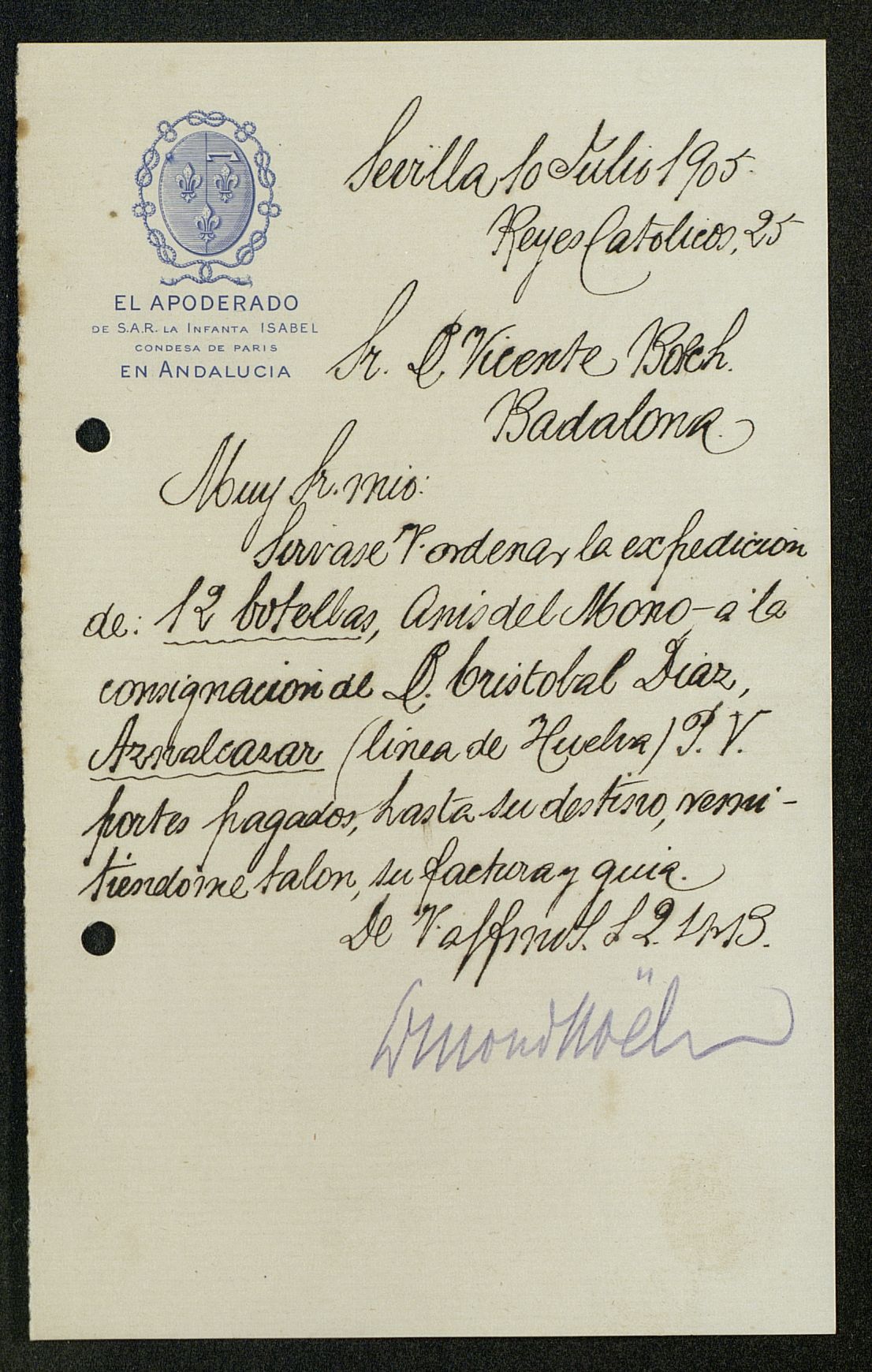 Pedido de 12 botellas de Anís del Mono por el apoderado de SAR la Infanta Isabel Condesa de París en Andalucía (España)