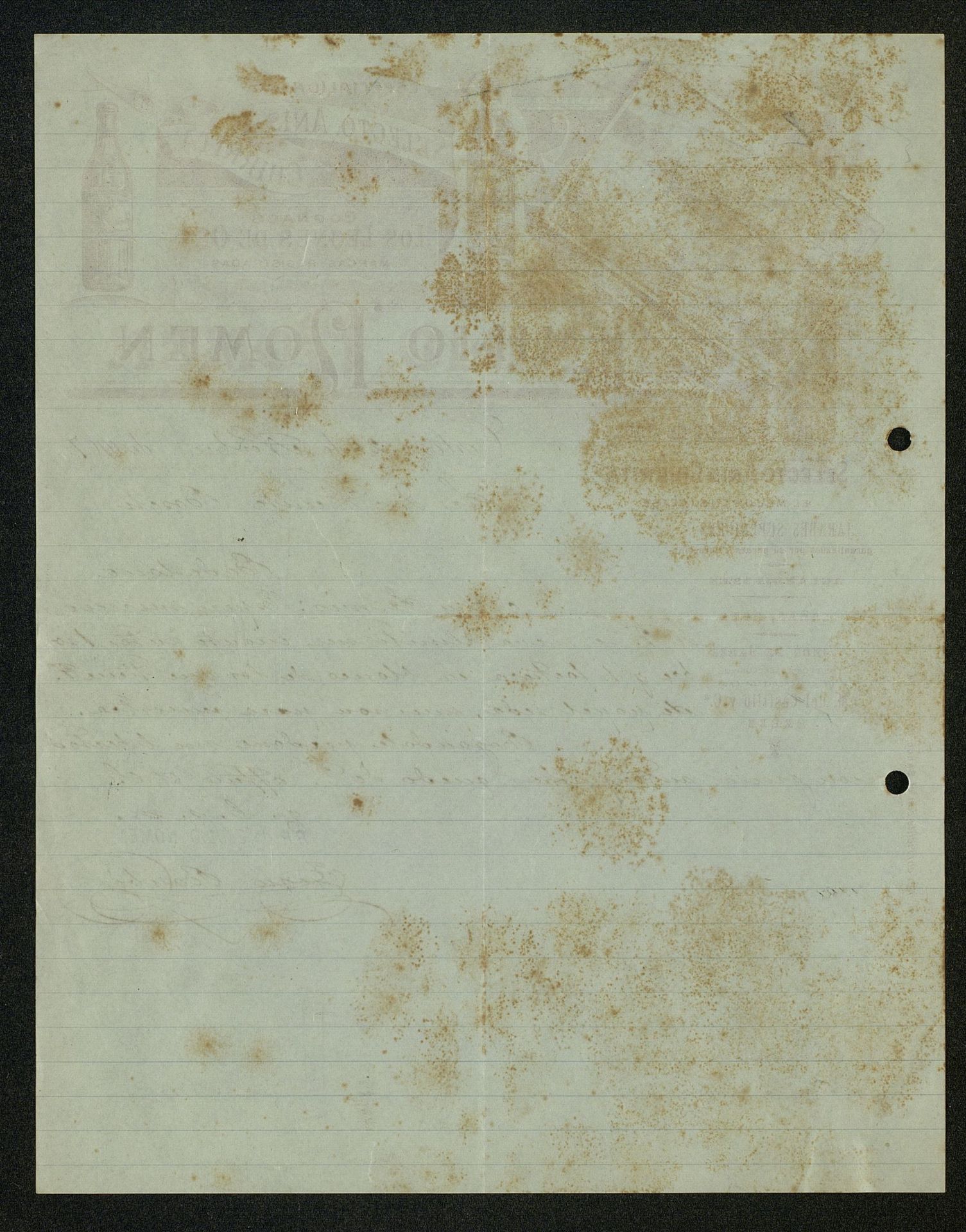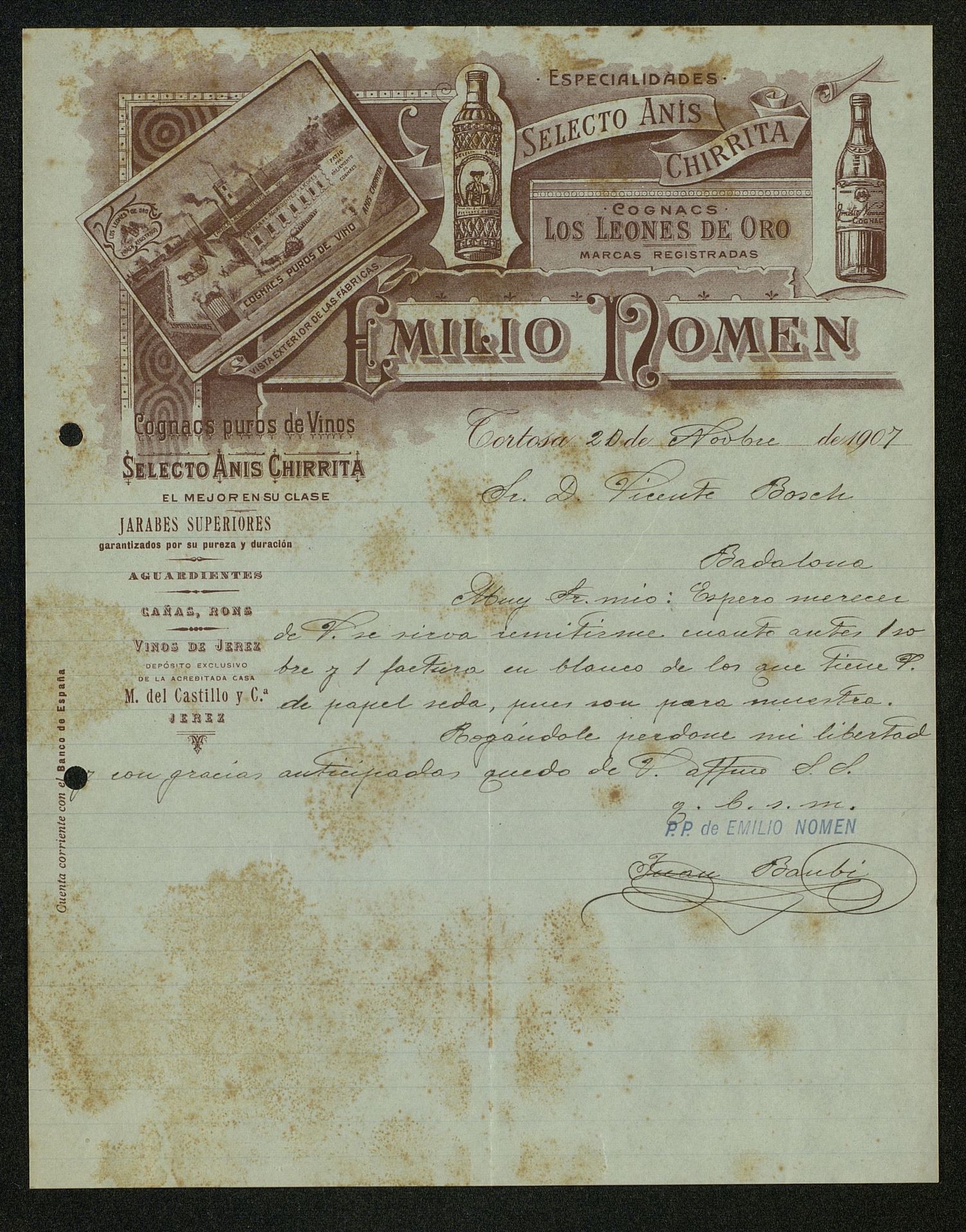 Pedido de Anís del Mono con papel seda como muestra para la casa Emilio Nomen de Anís Chirrita y otros vinos y cognacs