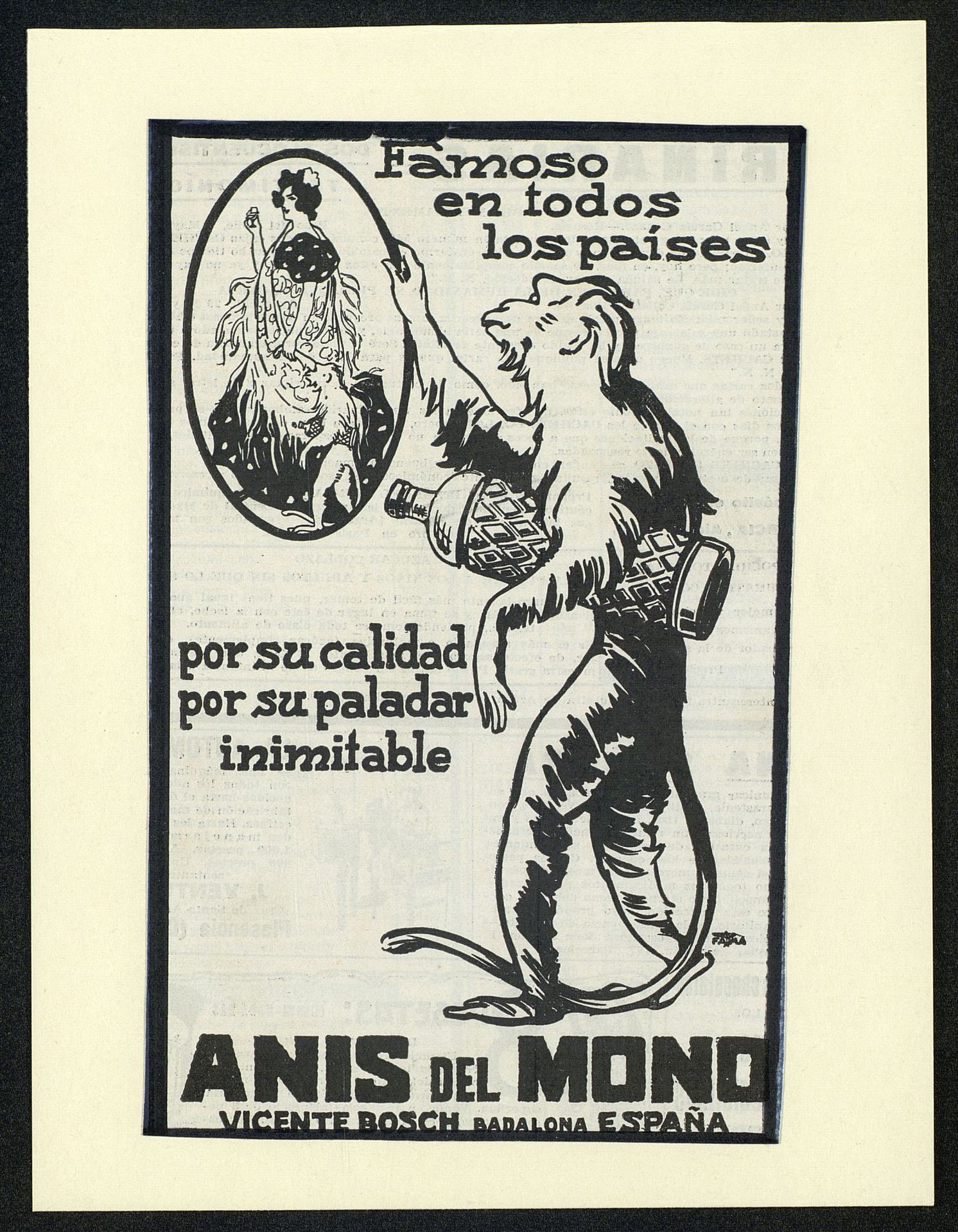 Famoso en todos los países por su calidad por su paladar inimitable. Anís del Mono, Vicente Bosch, Badalona (España) [Anuncio publicitario]