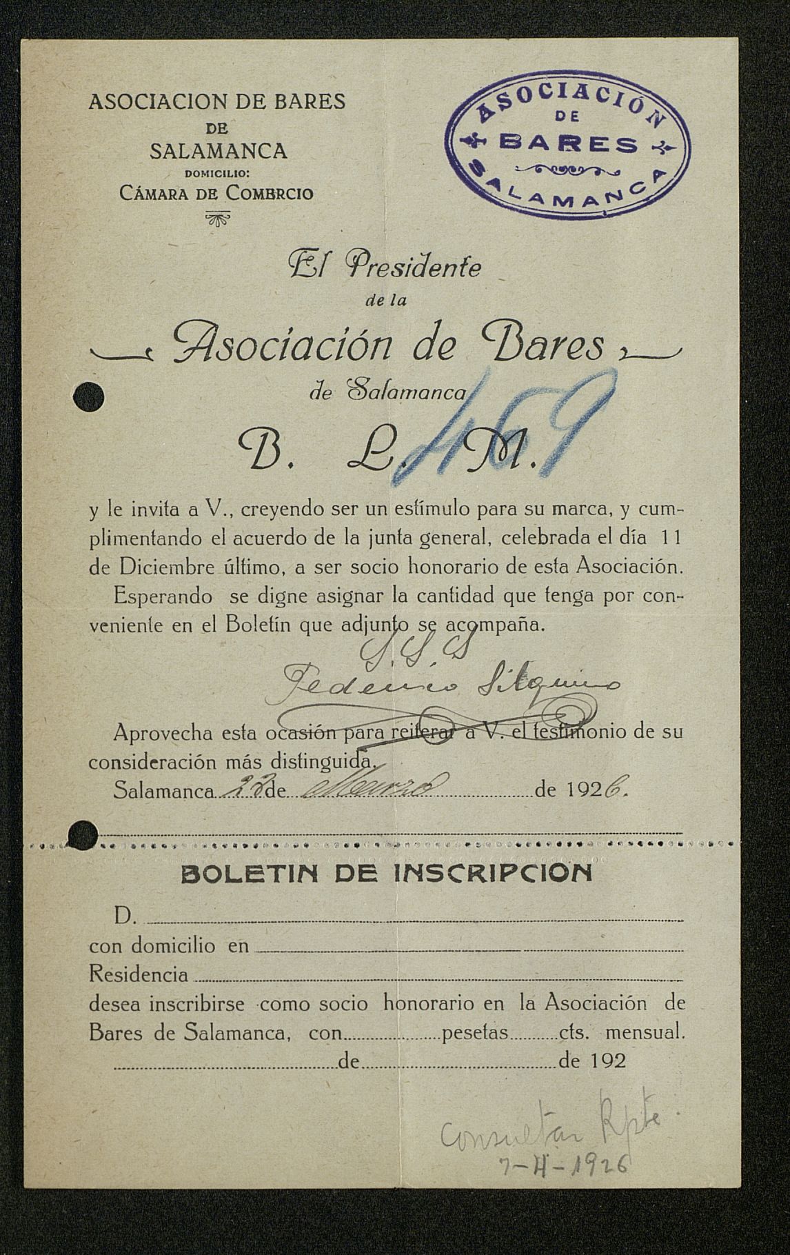 Invitación para asociarse a la Asociación de Bares de Salamanca (España)