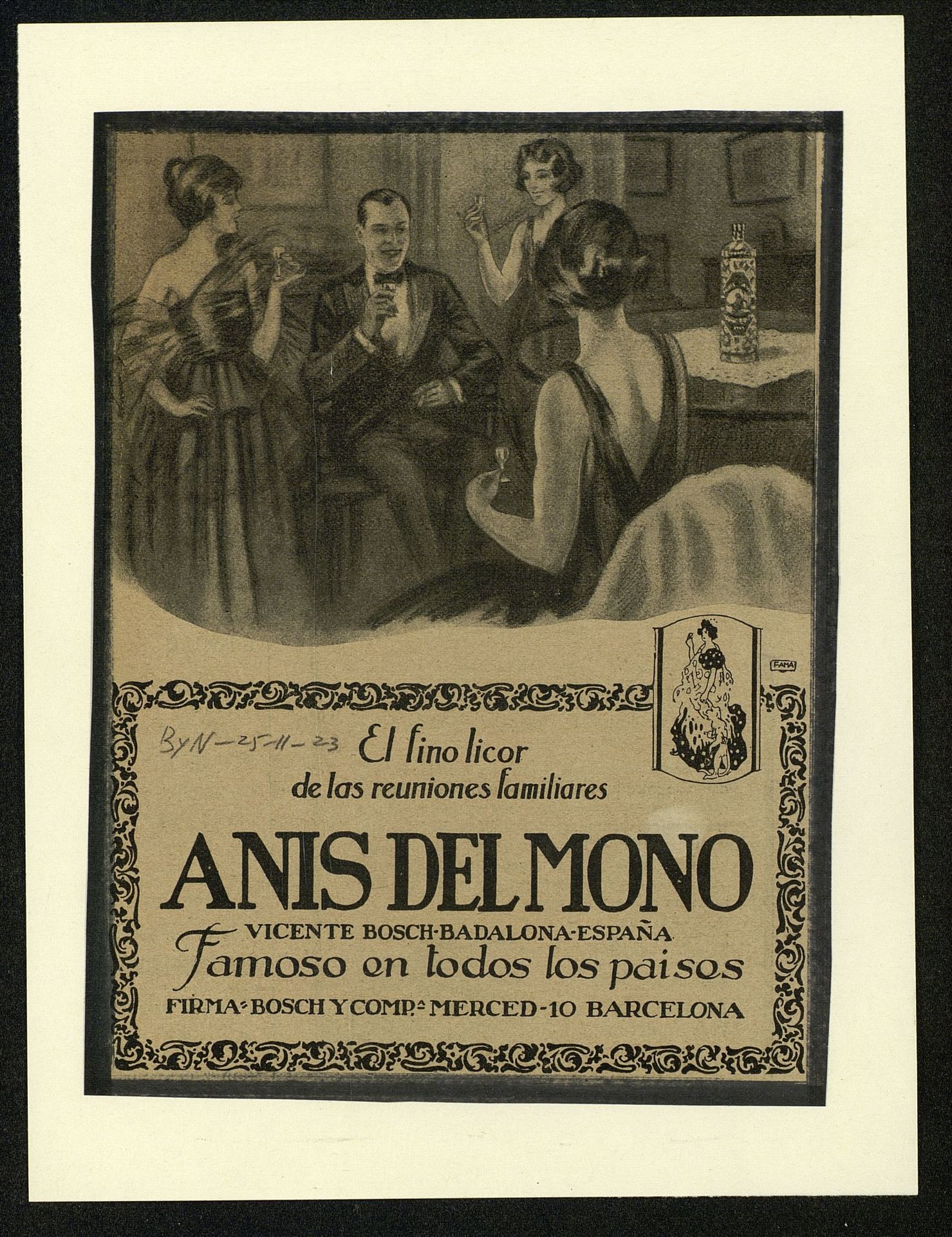El fino licor de las reuniones familiares. Anís del Mono, famoso en todos los países. Bosch y Compañía, Barcelona (Cataluña, España) [Anuncio publicitario]