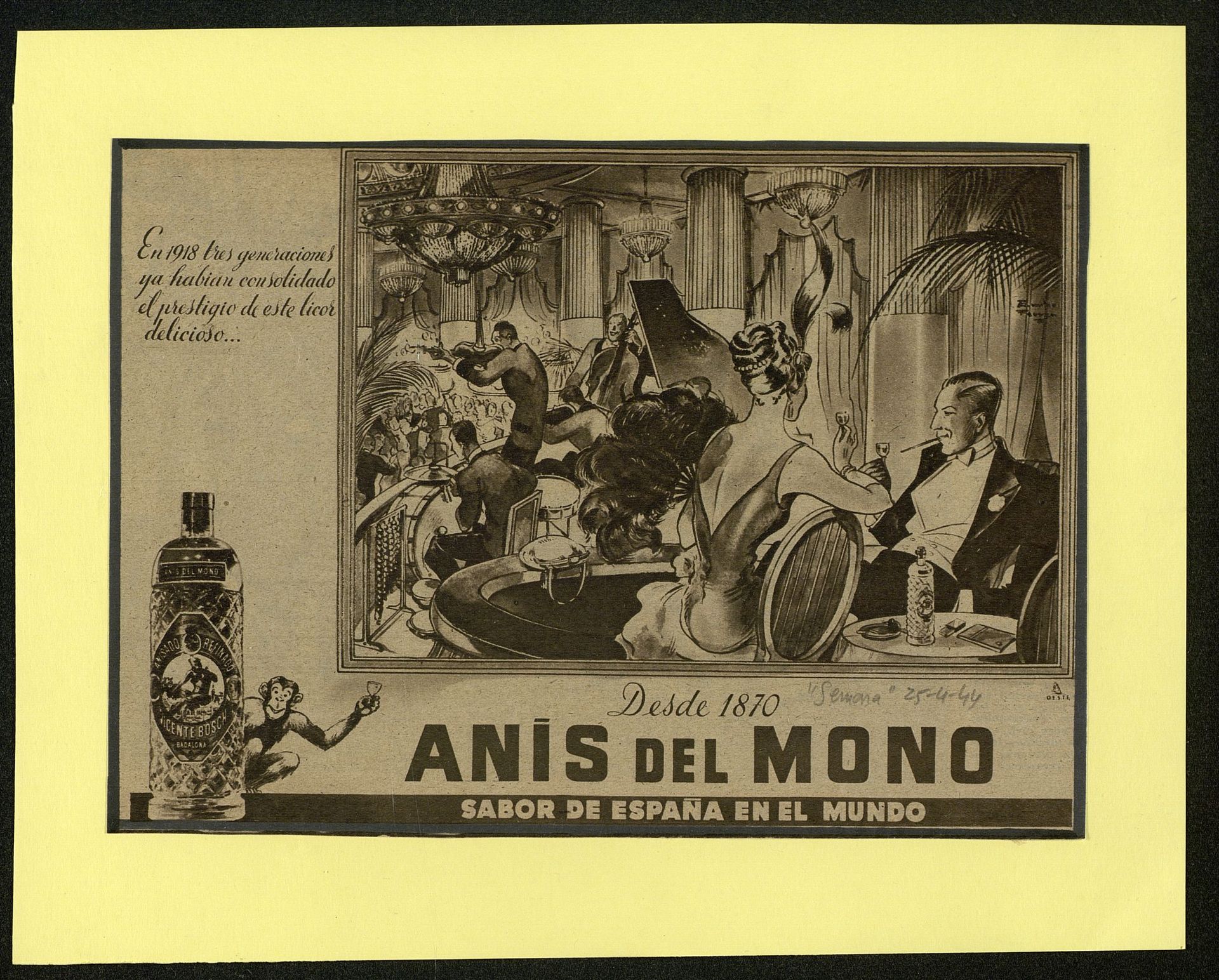 En 1918 tres generaciones ya habían consolidado el prestigio de este licor delicioso... Desde 1870 Anís del Mono. Sabor de España en el mundo. Emilio Ferrer, ilustrador [Anuncio publicitario]