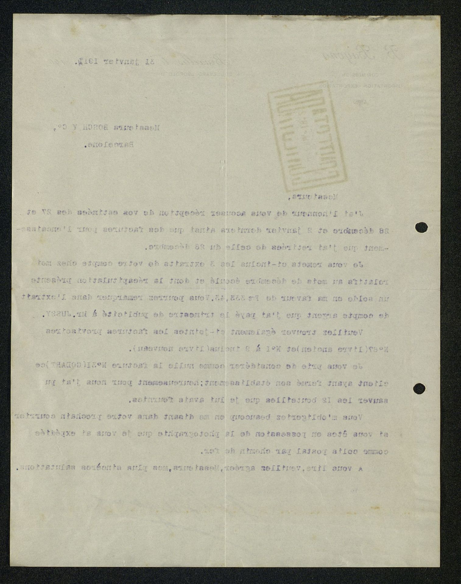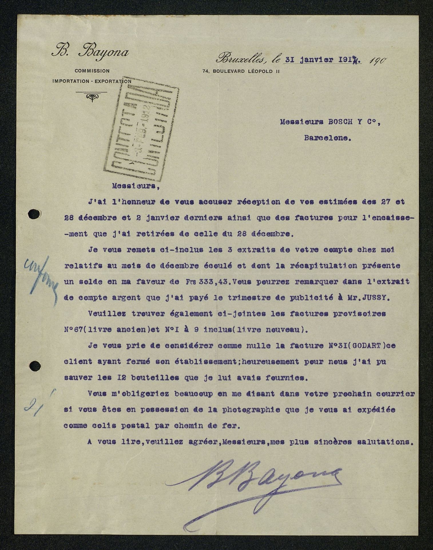 [Carta] 1914, del representante en Bruselas que recoge datos de inversión internacional de publicidad