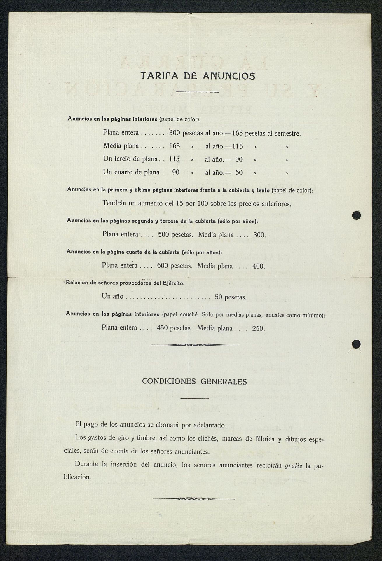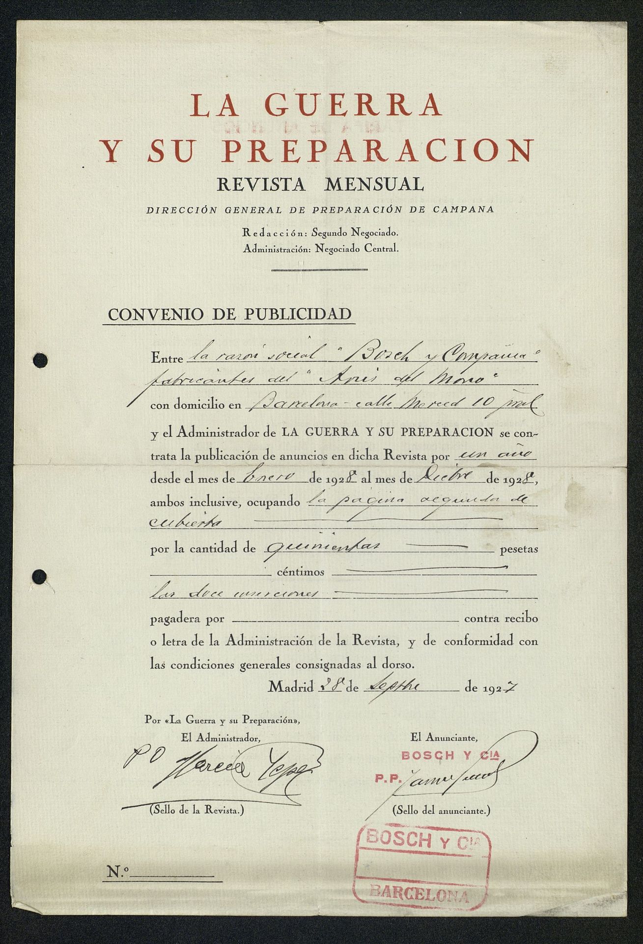 Convenio de Publicidad Bosch y Compañía con Revista mensual : Guerra y su preparación de la Director General de Preparación de Campaña