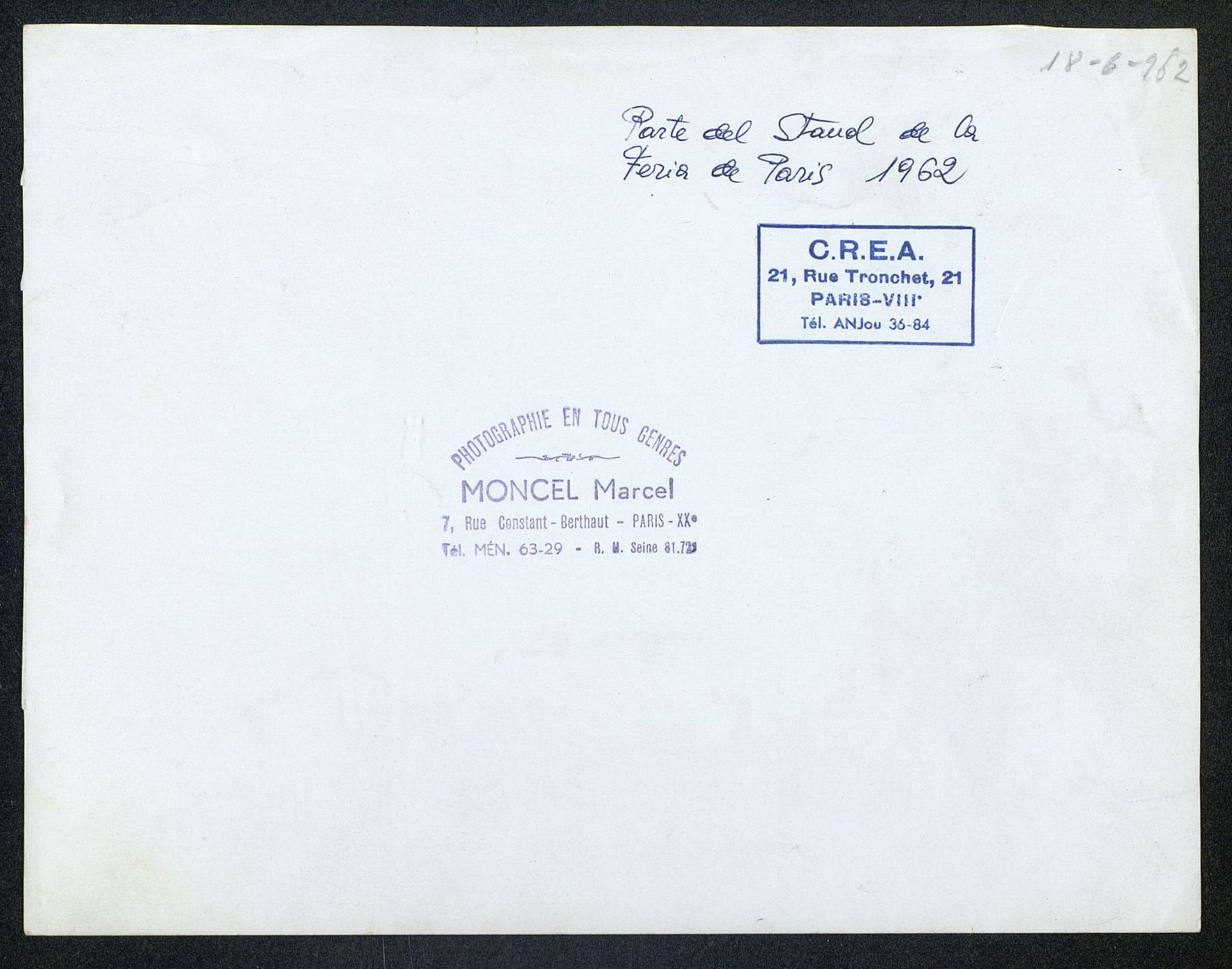 Stand de Anís del Mono en la Feria de París en junio de 1962. Con sello en trasera de Moncel Marcel [Fotografía]